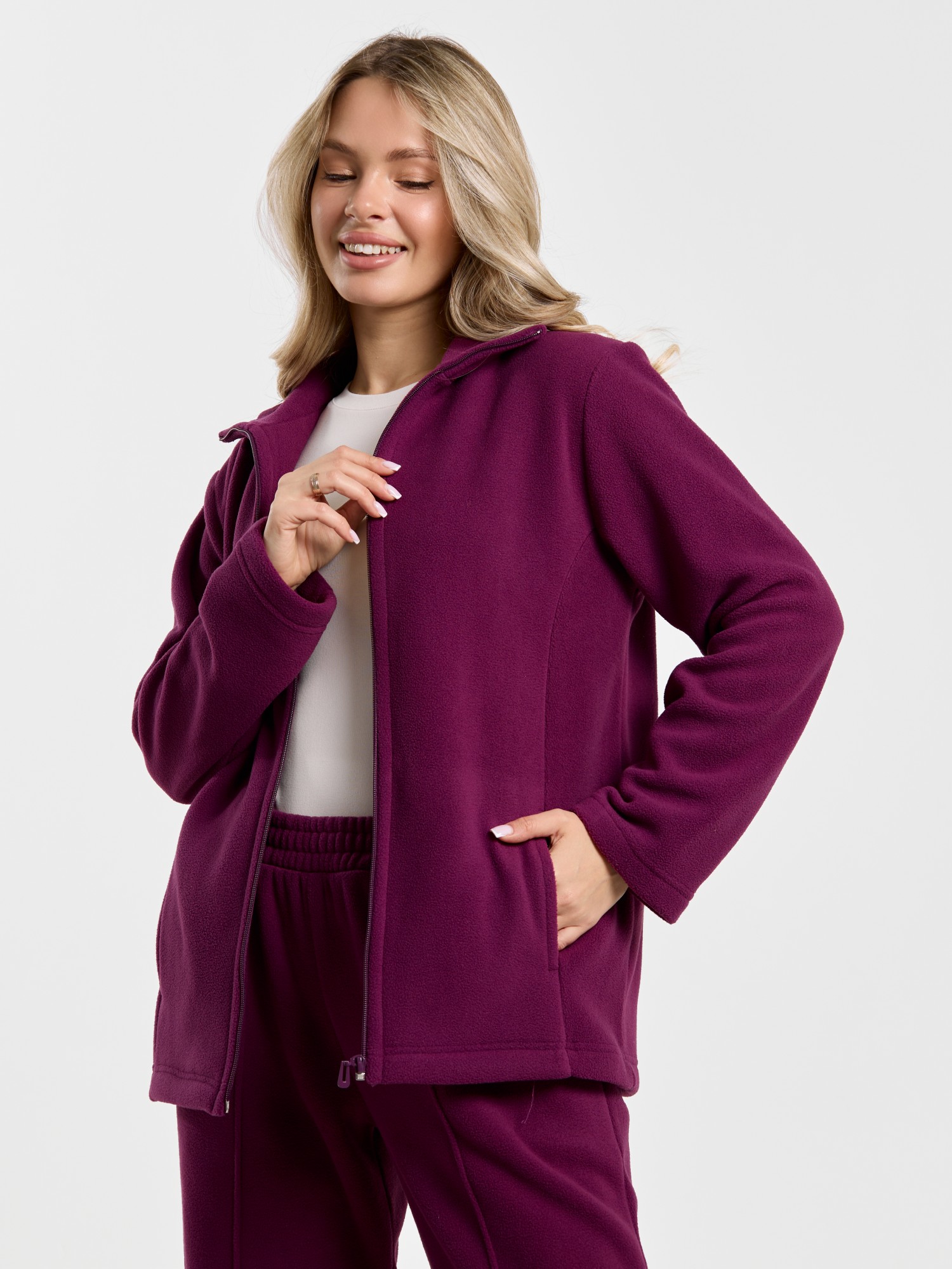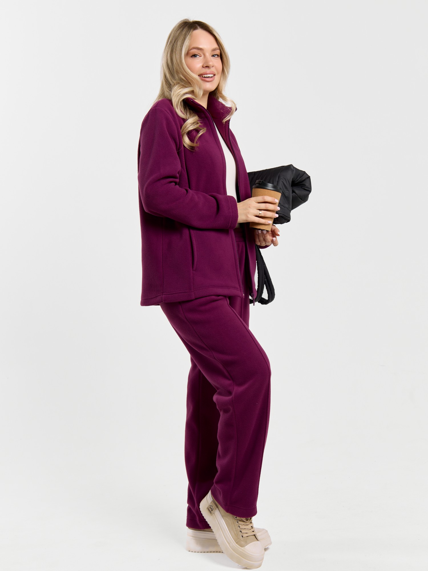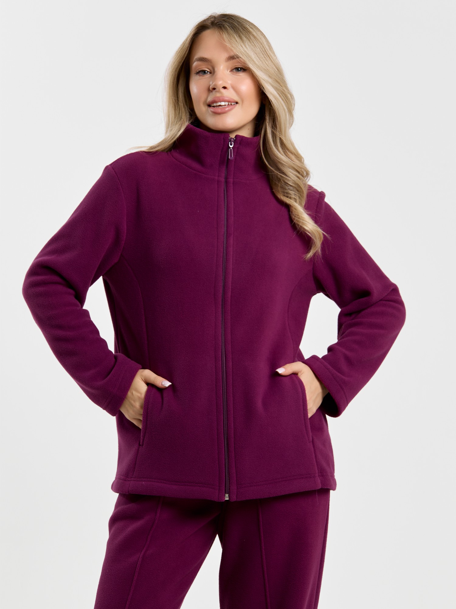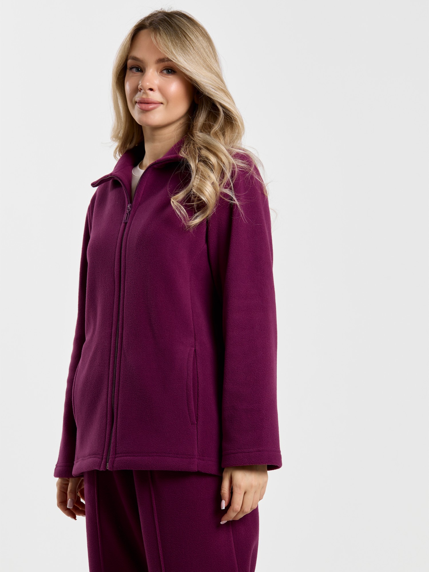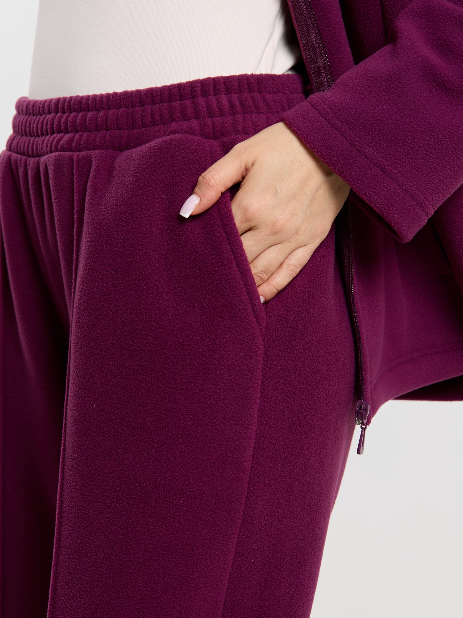 Костюм молодежный из гладкокрашенного трикотажного полотна «флис», Толстовка - полуприлегающего силуэта, с длинными втачными рукавами, воротником «стойка», карманами в рельефных швах, центральной бортовой застежкой на тесьму «молния». Брюки длинные, полуприлегающего силуэта, на притачном поясе с эластичной тесьмой внутри и карманами в боковых швах. Передние половины застрочены поцентральным линиям, низ брюк обработан подгибкой с вложением эластичной тесьмы и регулируется по ширине с помощью фиксаторов.