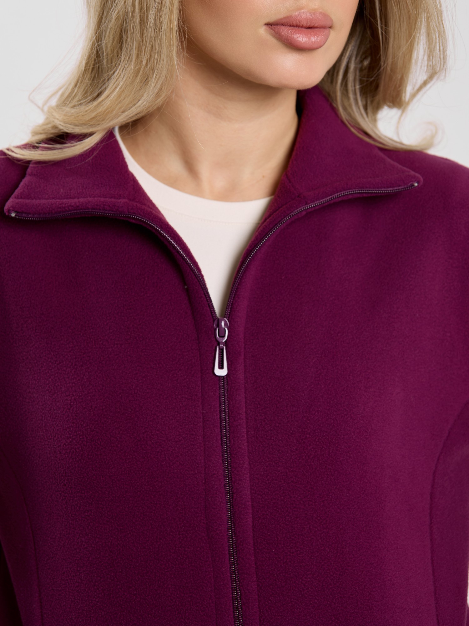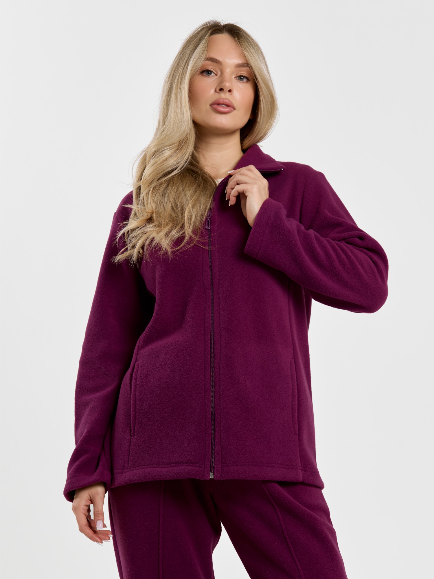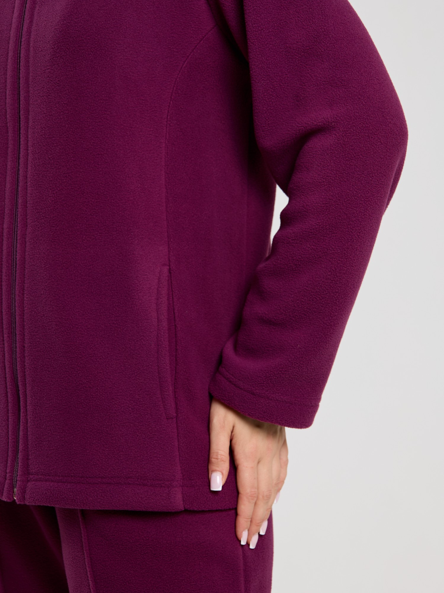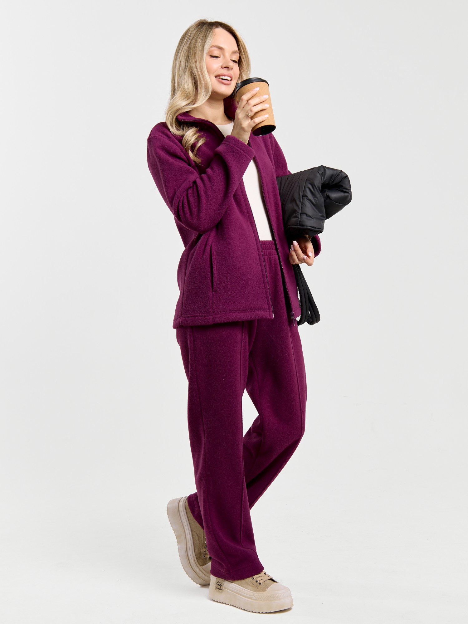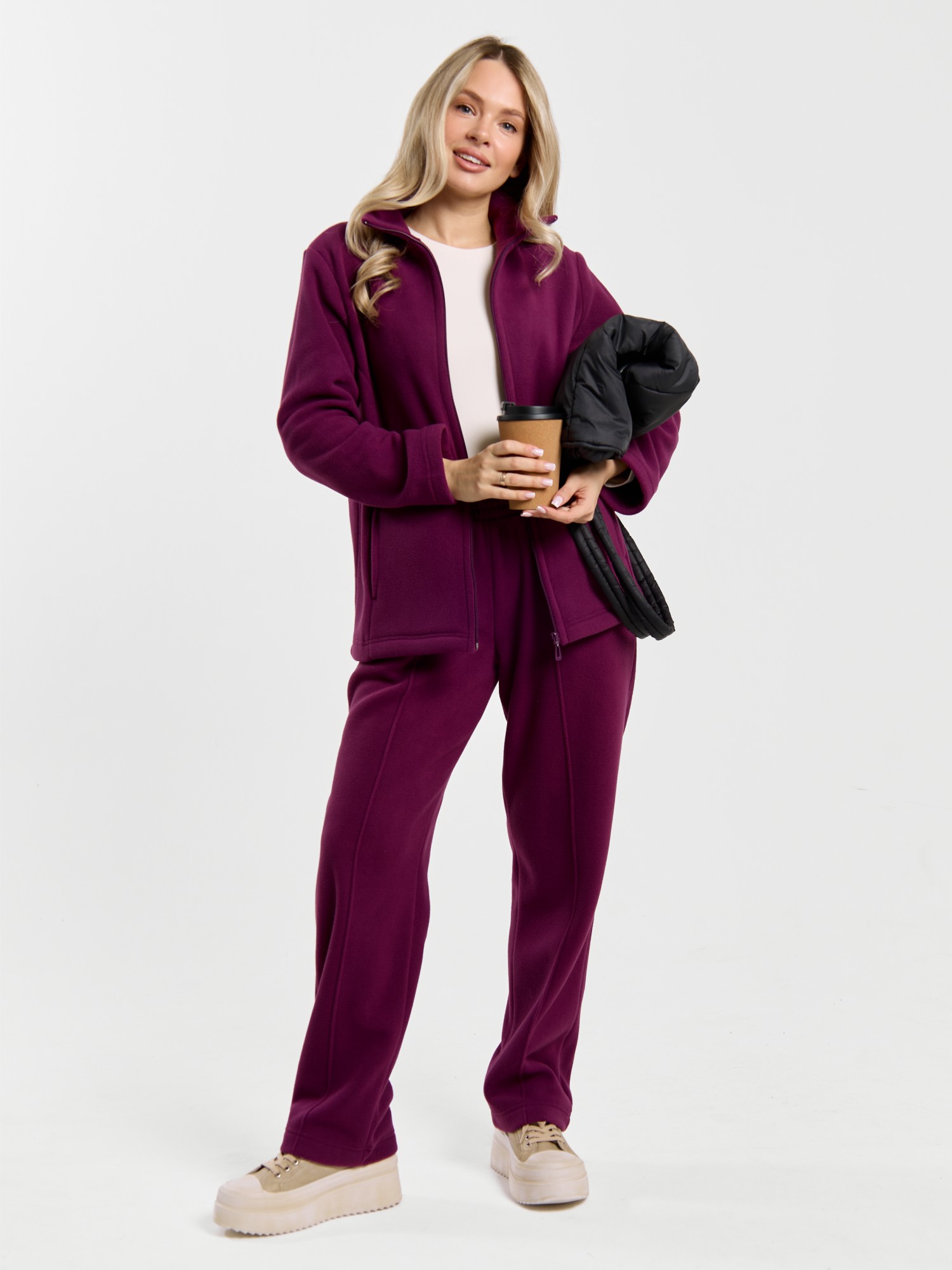 Костюм молодежный из гладкокрашенного трикотажного полотна «флис», Толстовка - полуприлегающего силуэта, с длинными втачными рукавами, воротником «стойка», карманами в рельефных швах, центральной бортовой застежкой на тесьму «молния». Брюки длинные, полуприлегающего силуэта, на притачном поясе с эластичной тесьмой внутри и карманами в боковых швах. Передние половины застрочены поцентральным линиям, низ брюк обработан подгибкой с вложением эластичной тесьмы и регулируется по ширине с помощью фиксаторов.
