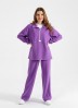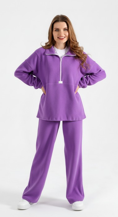 Костюм, состоящий из толстовки и брюк. Толстовка - свободного покроя, средней длины, с длинными рукавами на основе цельнокроеных. Деталь переда - с отрезной кокеткой, состоящей из четырех деталей, симметрично расположенных относительно центрального шва, обработанного с застежкой на тесьму "молния". Спинка - с отрезной кокеткой. Нижние срезы рукавов обработанышвом вподгибку с эластичной тесьмой. Низ изделия обработан швом вподгибку. По всем основным соединительным швам толстовки настрочены отделочные строчки. Брюки - длинные, свободного покроя, на притачном поясе с эластичной тесьмой внутри и карманами в боковых швах. Нижние срезы обработаны швом вподгибку с эластичной тесьмой. По низу джемпера и низу брюк - эластичная тесьма с фиксаторами для регулировки ширины изделий на этих участках.
