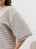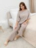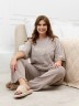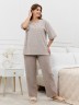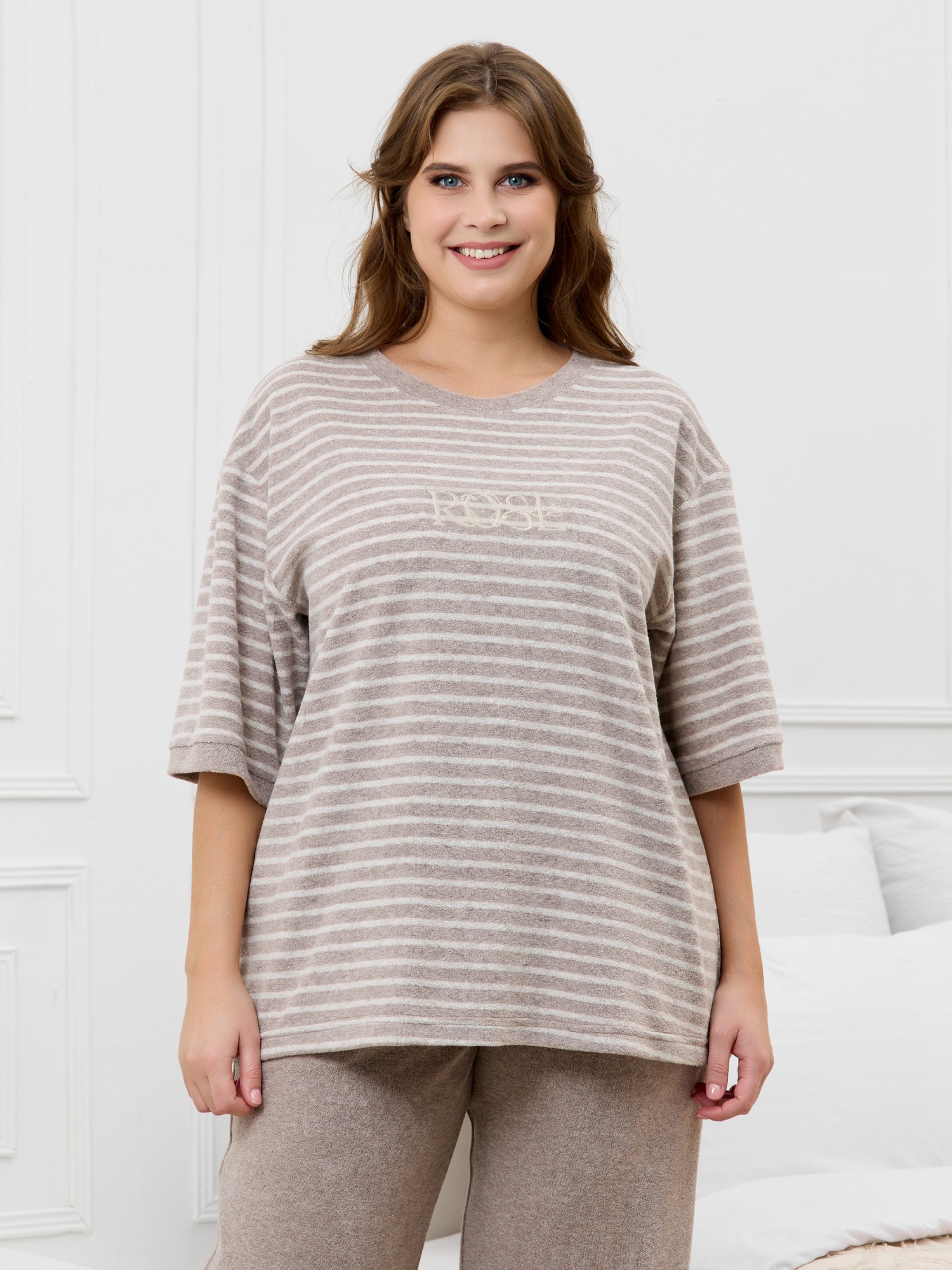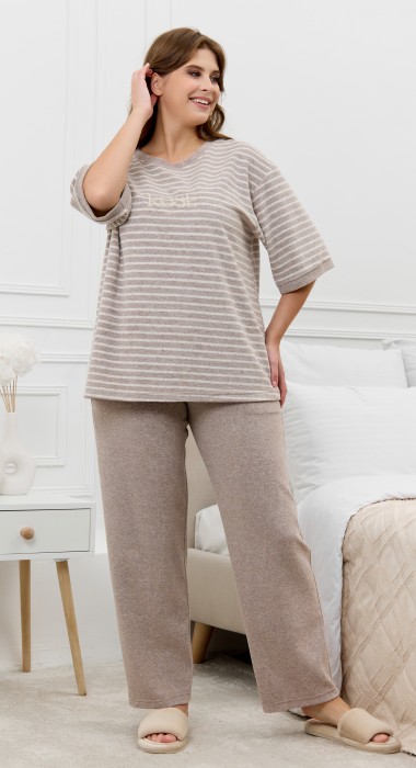 Костюм женский из трикотажного полотна «махра» в комбинации двух видов в единой цветовой гамме, состоящий из футболки и брюк. Футболка – из полотна в « полоску», с втачными короткими рукавами, горловиной овальной формы, обработанной втачной планкой и вышивкой по центру переда. Планка горловины и манжеты на рукавах выполнены из контрастного полотна «махра меланж».Брюки – из полотна «махра меланж» классического покроя, с карманами в боковых швах, на притачном поясе с эластичной тесьмой внутри.