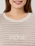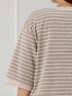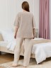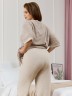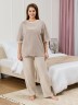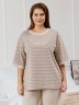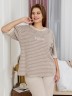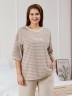 Костюм женский из трикотажного полотна «махра» в комбинации двух видов в единой цветовой гамме, состоящий из футболки и брюк. Футболка – из полотна в « полоску», с втачными короткими рукавами, горловиной овальной формы, обработанной втачной планкой и вышивкой по центру переда. Планка горловины и манжеты на рукавах выполнены из контрастного полотна «махра меланж».Брюки – из полотна «махра меланж» классического покроя, с карманами в боковых швах, на притачном поясе с эластичной тесьмой внутри.