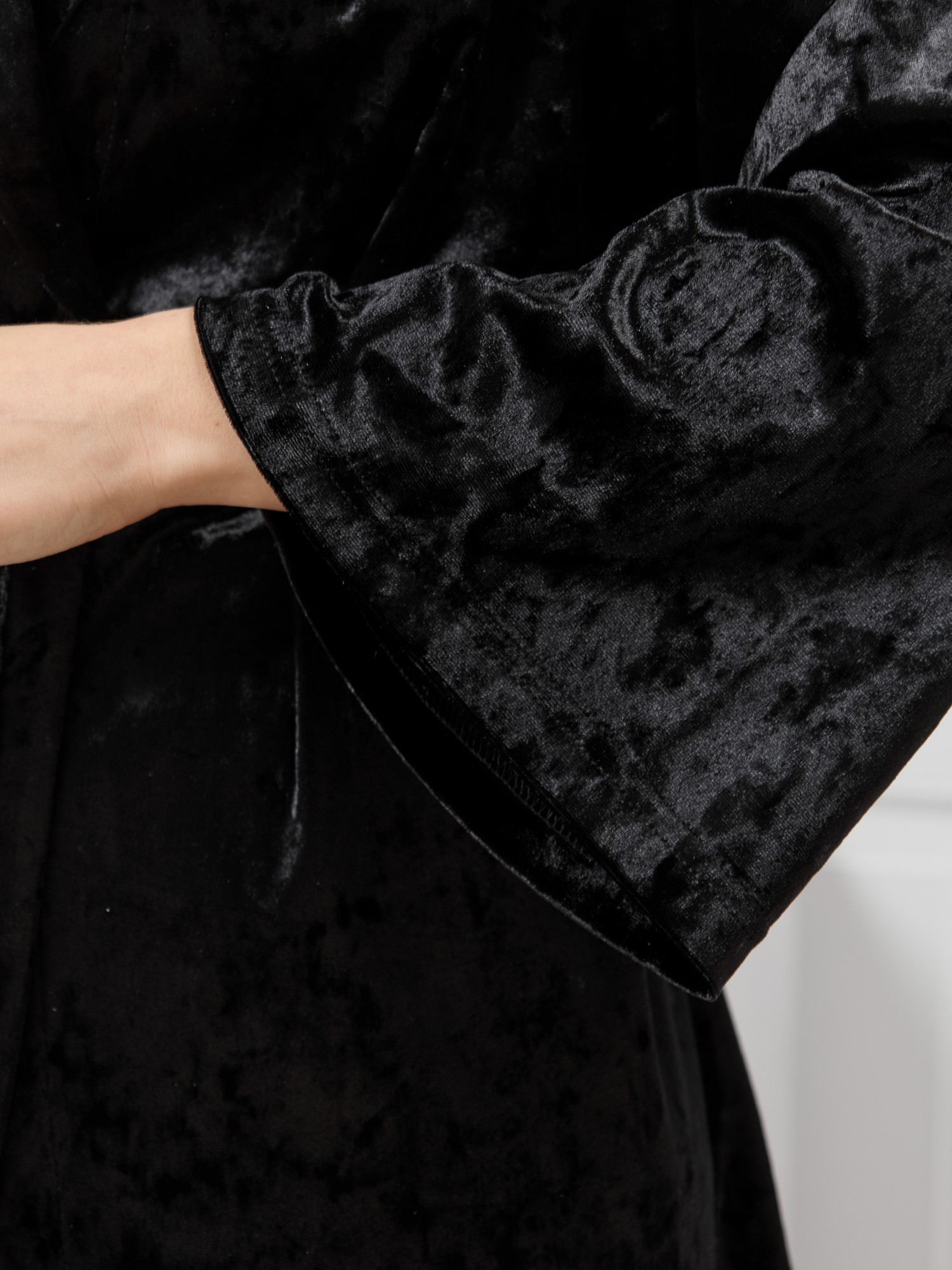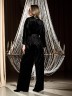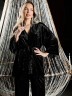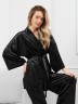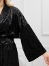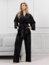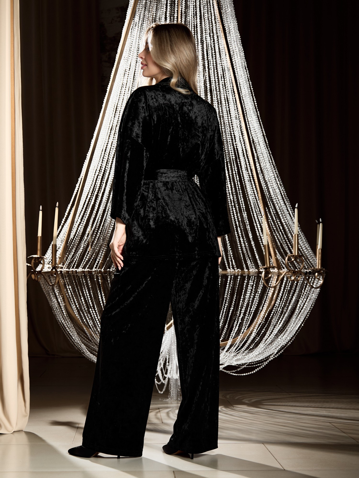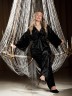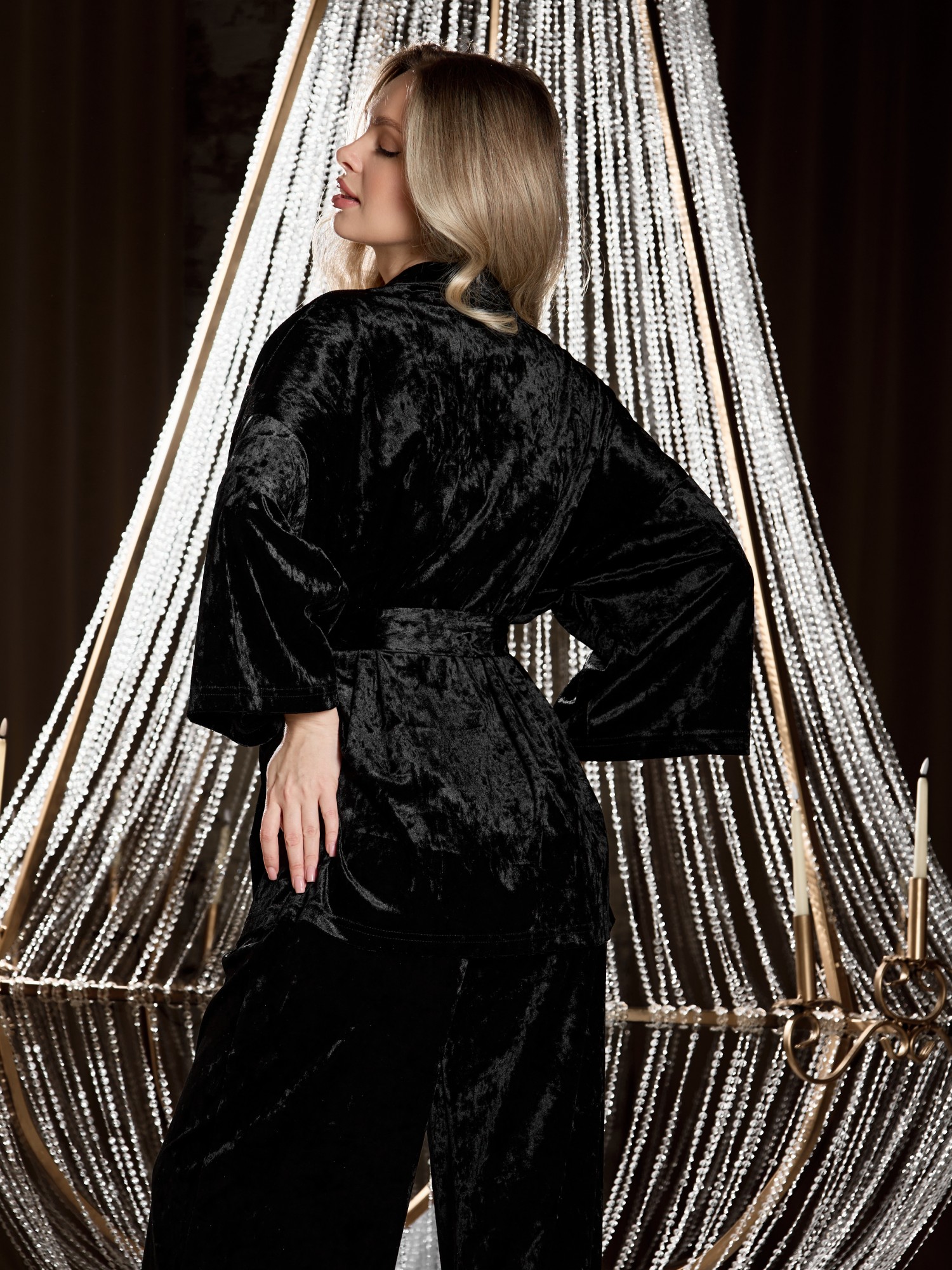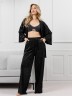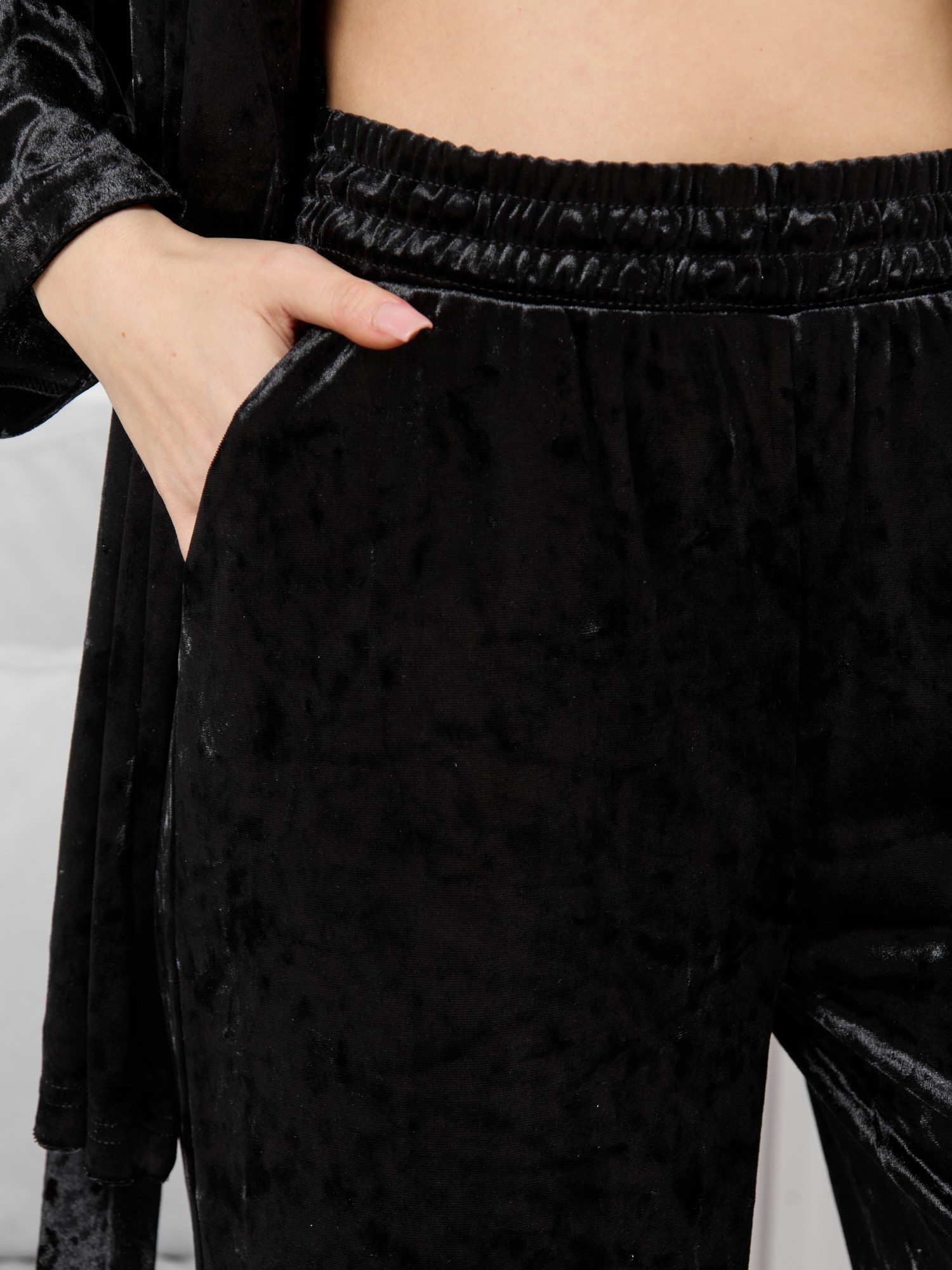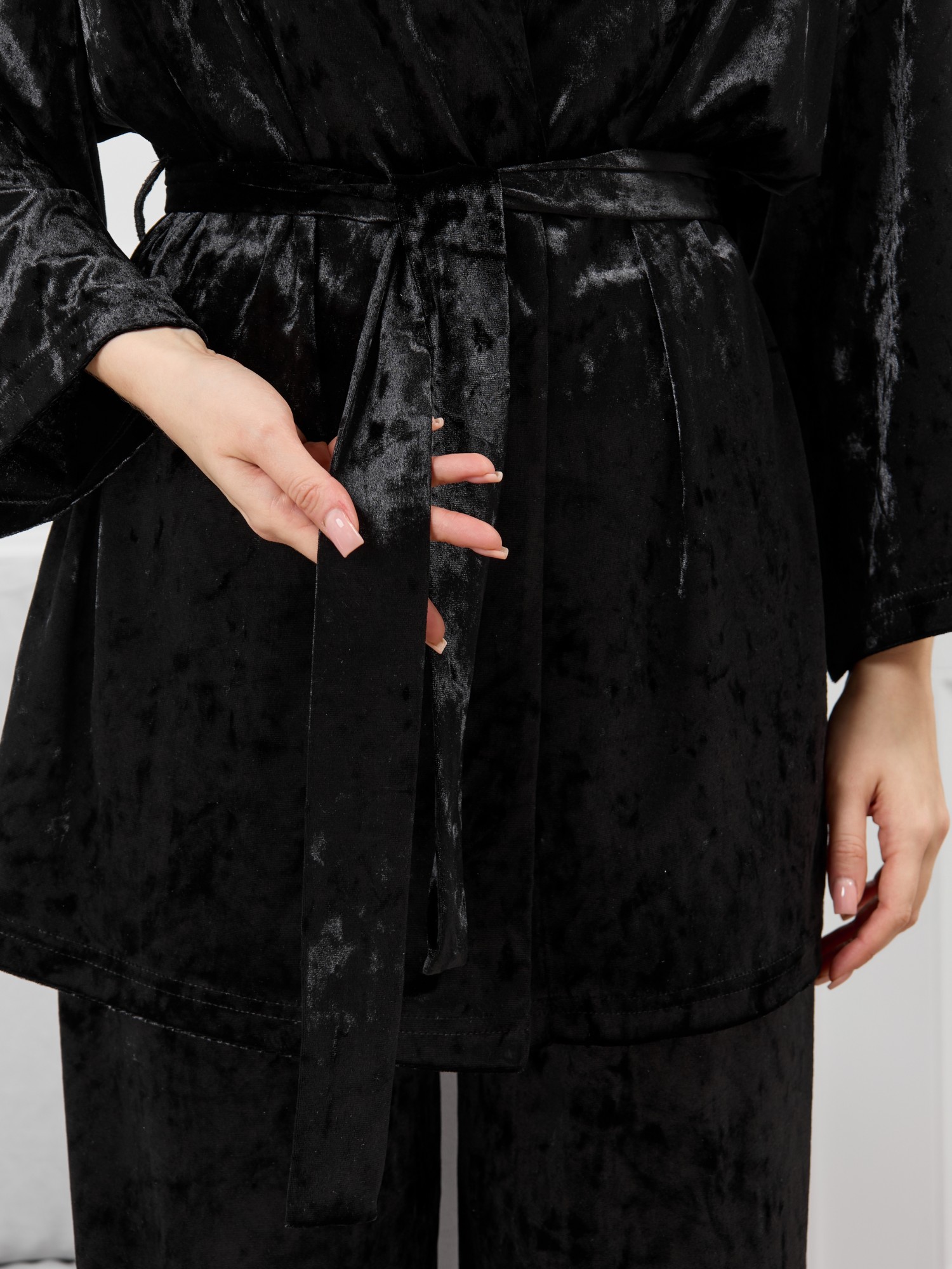 Костюм молодежный из гладкокрашенного полотна «велюр стрейч» с мраморным эффектом, состоящий из кимоно и брюк. Кимоно прямого кроя, свободное, на запахе, с втачными рукавами ¾ длины и съемным поясом, фиксирующимся на талии двумя шлевками в боковых швах.Брюки свободные, на притачном поясе с эластичной тесьмой внутри и карманами в боковых швах.