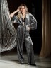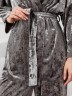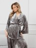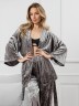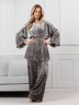 Костюм молодежный из гладкокрашенного полотна «велюр стрейч» с мраморным эффектом, состоящий из кимоно и брюк. Кимоно прямого кроя, свободное, на запахе, с втачными рукавами ¾ длины и съемным поясом, фиксирующимся на талии двумя шлевками в боковых швах.Брюки свободные, на притачном поясе с эластичной тесьмой внутри и карманами в боковых швах.
