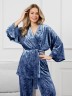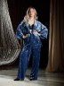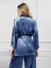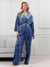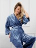Костюм молодежный из гладкокрашенного полотна «велюр стрейч» с мраморным эффектом, состоящий из кимоно и брюк. Кимоно прямого кроя, свободное, на запахе, с втачными рукавами ¾ длины и съемным поясом, фиксирующимся на талии двумя шлевками в боковых швах.Брюки свободные, на притачном поясе с эластичной тесьмой внутри и карманами в боковых швах.