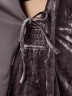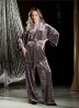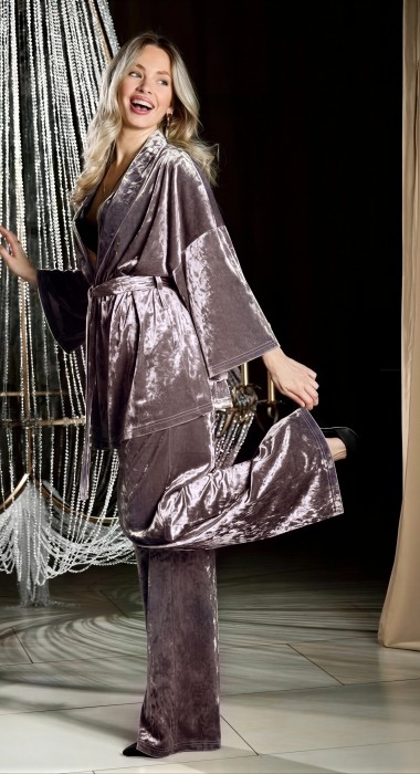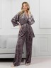 Костюм молодежный из гладкокрашенного полотна «велюр стрейч» с мраморным эффектом, состоящий из кимоно и брюк. Кимоно прямого кроя, свободное, на запахе, с втачными рукавами ¾ длины и съемным поясом, фиксирующимся на талии двумя шлевками в боковых швах.Брюки свободные, на притачном поясе с эластичной тесьмой внутри и карманами в боковых швах.