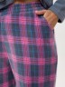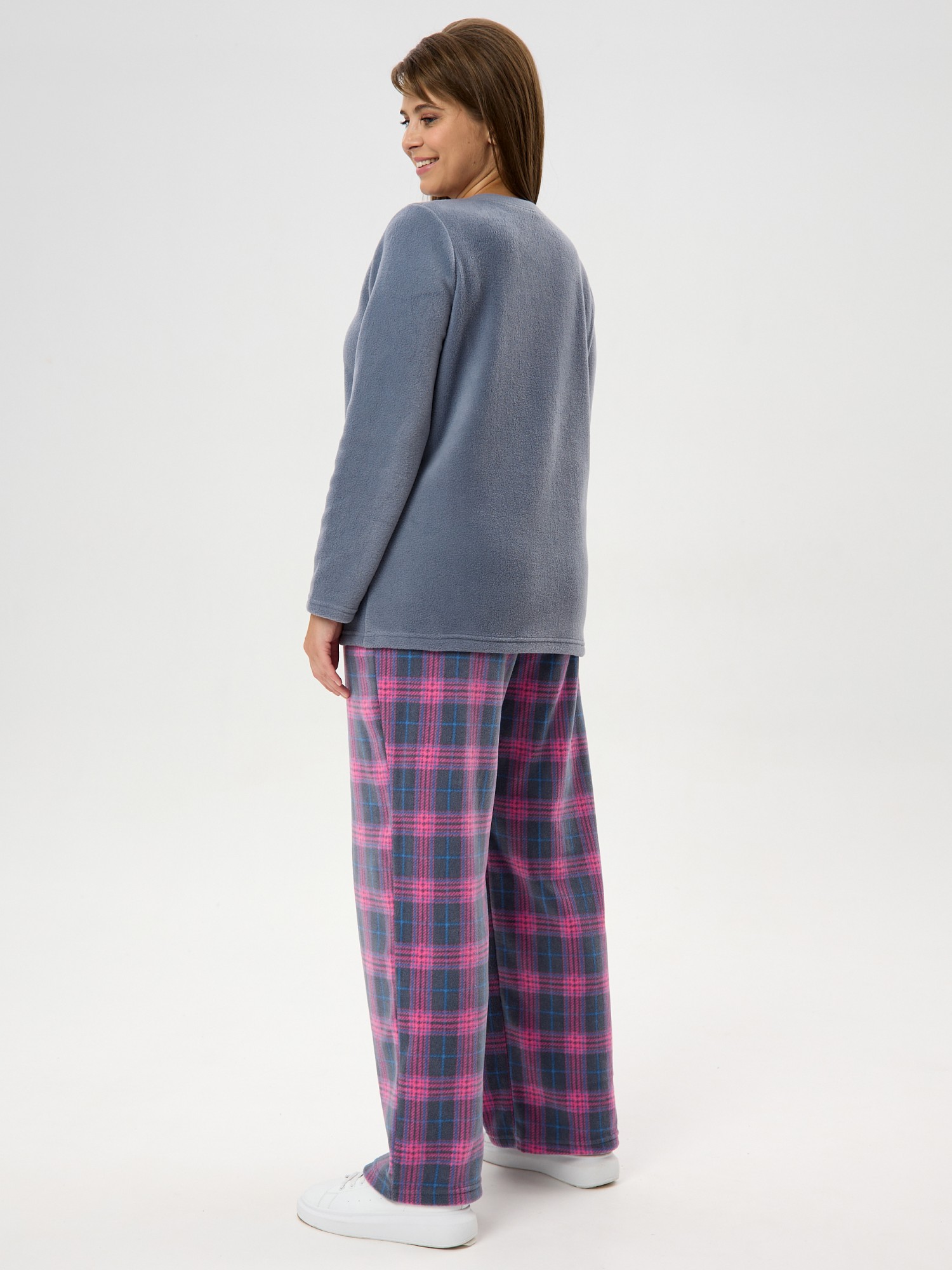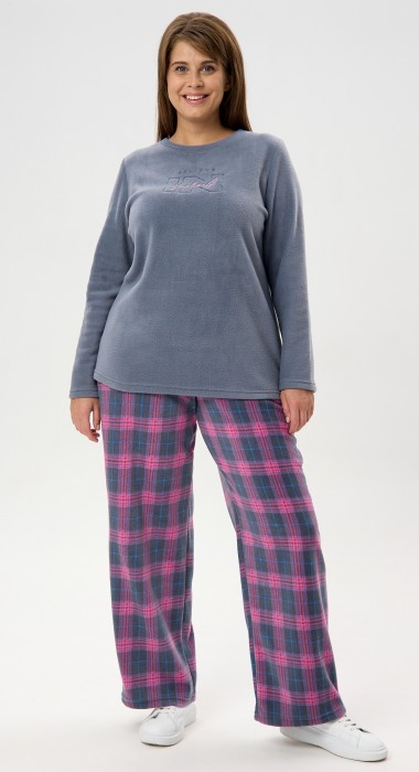 Костюм женский из трикотажного полотна «флис» в комбинации двух видов: с набивным рисунком «клетка» и гладкокрашеного в единой цветовой гамме, состоящий из джемпера и брюк.Джемпер - из гладкокрашенного полотна, классического покроя, с длинными втачными рукавами, горловиной овальной формы, обработанной втачной планкой и вышивкой в центре полочки.Брюки – из полотна с рисунком в клетку, длинные, свободные, на поясе с эластичной тесьмой внутри и карманами в боковых швах.