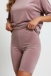 Костюм из гладкокрашеного трикотажного полотна «велюр стрейч», состоящий из футболки и леггинсов. Футболка – удлиненная, свободного покроя, со спущенной, линией плеча, короткими втачными рукавами, горловиной овальной формы, обработанной втачной планкой.Леггинсы – длиной до колен, с эластичной тесьмой по талии.
