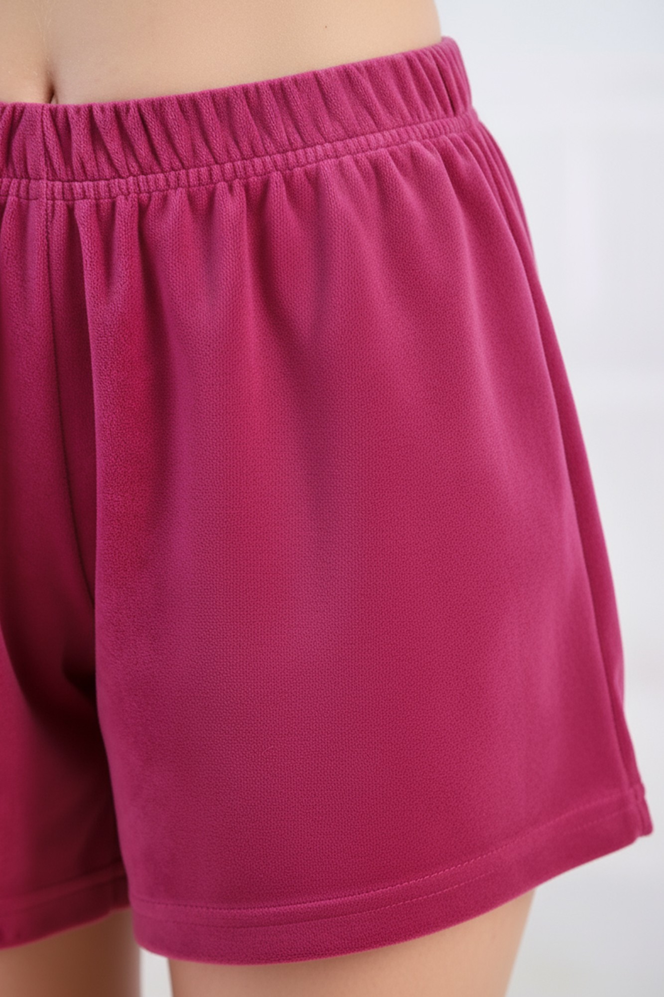 Костюм молодежный из трикотажного полотна «велюр-стрейч», состоящий из футболки и шорт. Футболка – классического покроя, с короткими цельнокроеными рукавами и горловиной овальной формы, обработанной втачной планкой. Шорты - средней длины, расширенные книзу, с эластичной тесьмой по талии.
