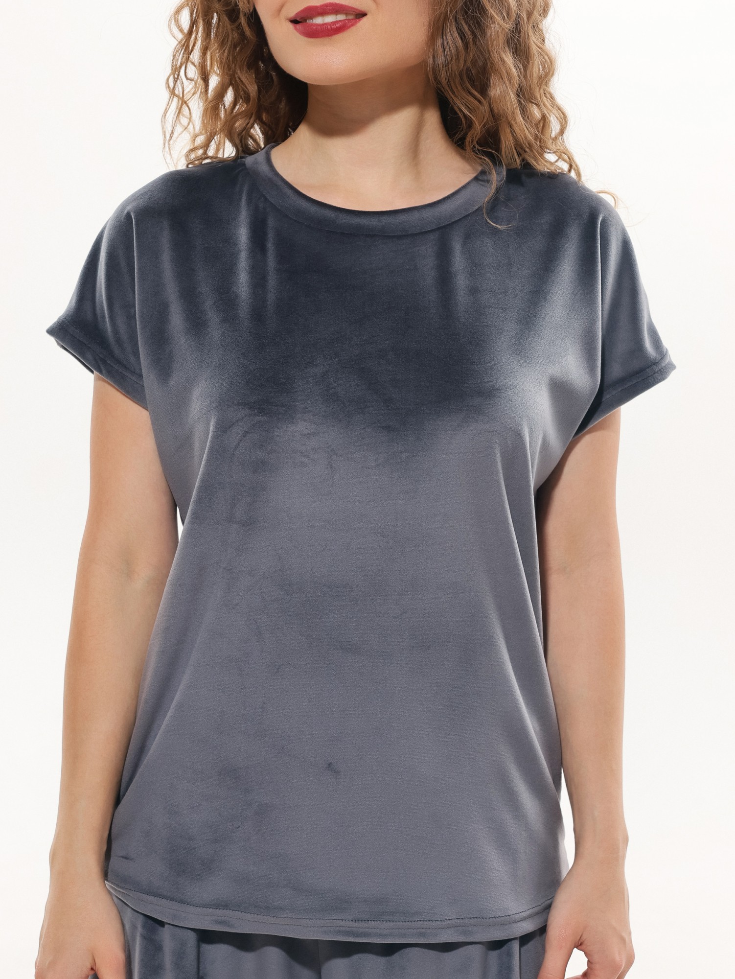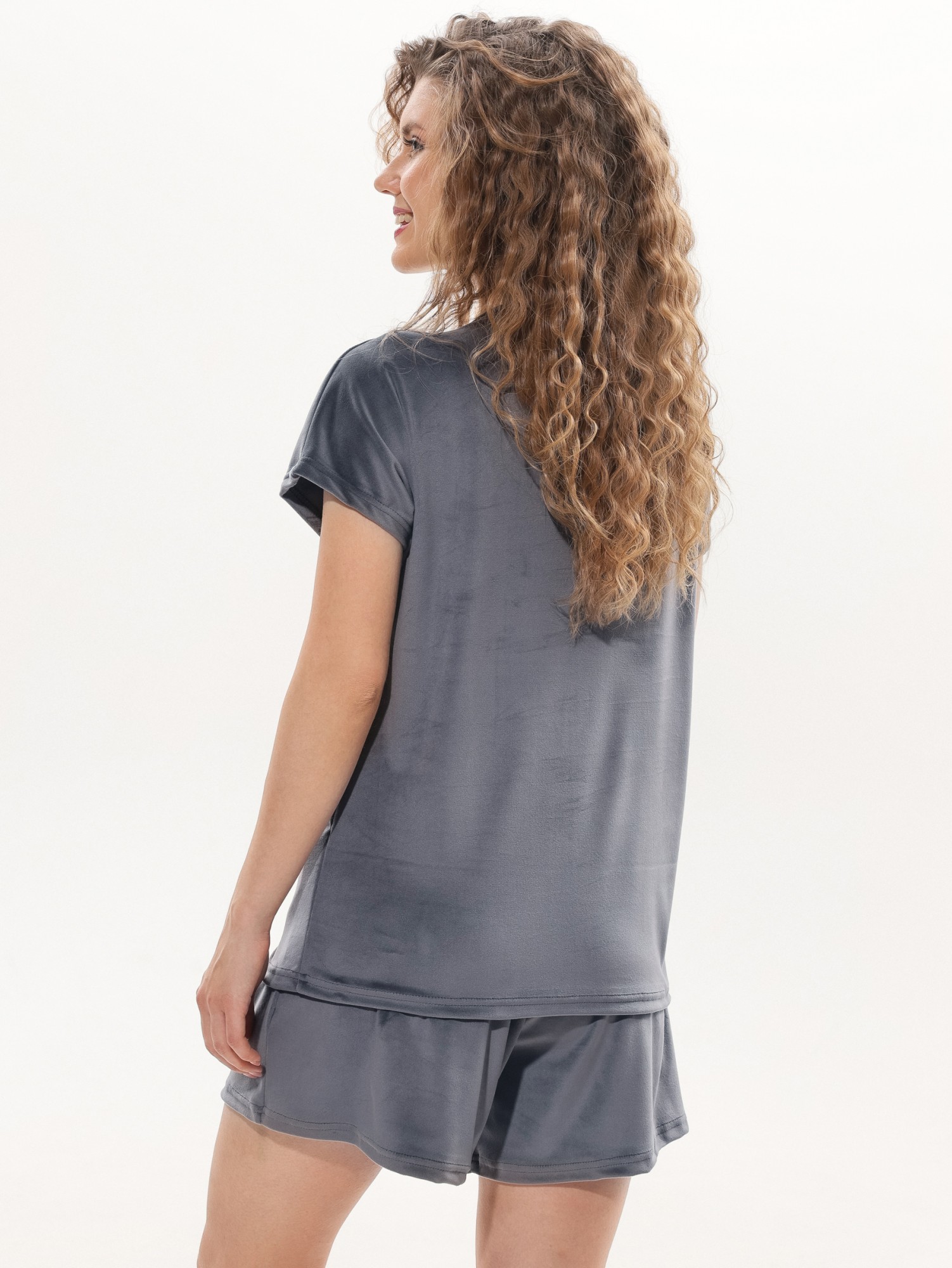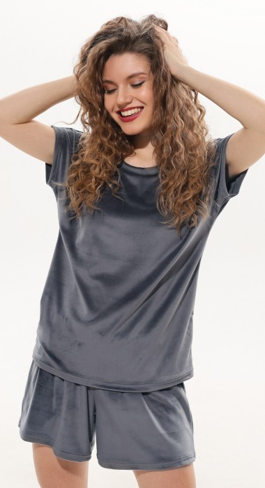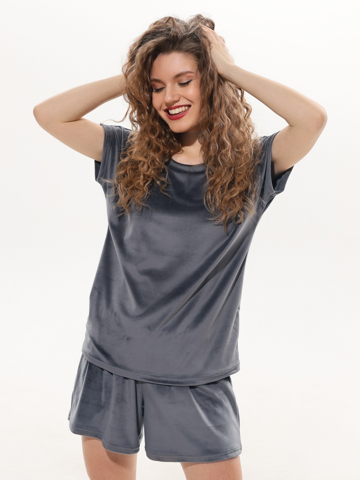 Костюм молодежный из трикотажного полотна «велюр-стрейч», состоящий из футболки и шорт. Футболка – классического покроя, с короткими цельнокроеными рукавами и горловиной овальной формы, обработанной втачной планкой. Шорты - средней длины, расширенные книзу, с эластичной тесьмой по талии.
