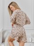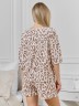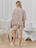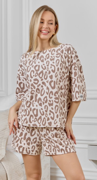 Костюм молодежный из трикотажного полотна «махра» с набивным рисунком, состоящий из футболки и шорт.Футболка – свободного кроя, с короткими втачными рукавами длиной до локтя, широкойгорловиной овальной формы. На левом рукаве по центру настрочен декоративный элемент.Шорты – средней длины, свободные, с эластичной тесьмой по талии.