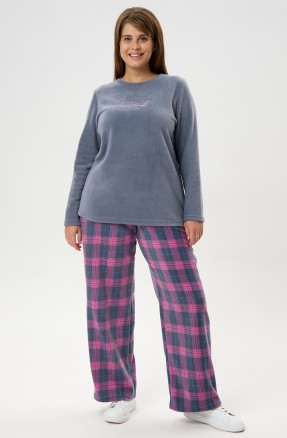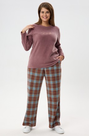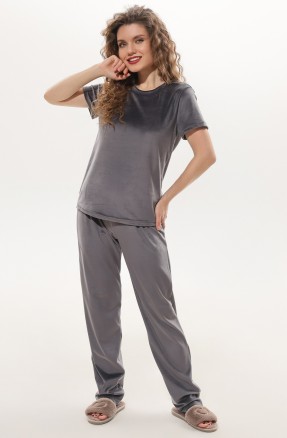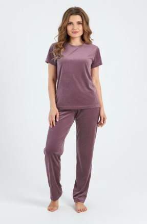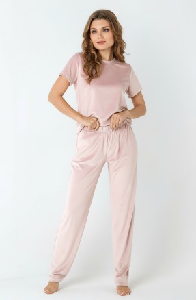 Брюки – длинные, прилегающего силуэта, с эластичной тесьмой по талии. Подгибка верхнего и нижних срезов обработаны пяти ниточной строчкой в цвет основного материала.