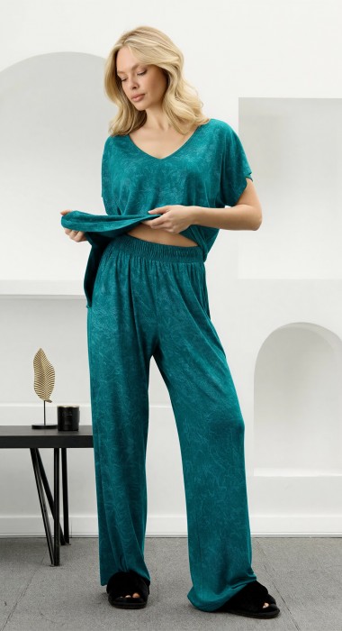 Костюм женский в комбинации двух видов полотен: из гладкокрашенного трикотажного вискозного полотна с эффектом «варенка», состоящий из футболки и брюк. Футболка - свободного покроя, с короткими цельнокроеными рукавами, горловиной V-образной формы, окантованной основным материалом и разрезами в боковых швах. Модной деталью является разница длин между полочкой и спинкой.Брюки – длинные, свободные, на притачном поясе с эластичной тесьмой внутри.
