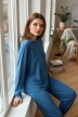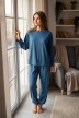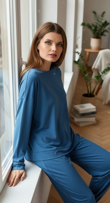 Пижама молодежная из гладкокрашеного трикотажного полотна «джерси», состоящая из лонгслива и брюк. Лонгслив - свободного покроя, с длинными втачными рукавами и горловиной овальной формы. Горловина окантована основным материалом, низ изделия с притачным поясом.Брюки – свободного покроя, с эластичной тесьмой по талии и нижним срезам.