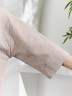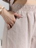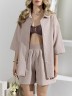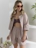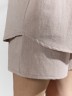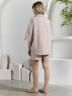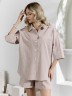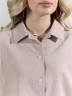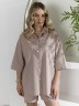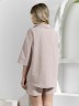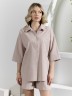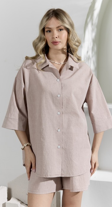 Костюм женский из гладкокрашеного фактурного полотна, состоящий их рубашки и шорт. Рубашка - с втачными рукавами длиной чуть ниже локтя, с приспущенным плечом, стояче-отложным воротником, фигурной линией низа и центральной бортовой застежкой на обметанные петли и пуговицы. Рукава - с притачными манжетами. Шорты - средней длины, на притачном поясе с эластичной тесьмой внутри, с карманами в боковых швах. Нижние срезы обработаны подгибкой.