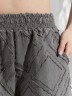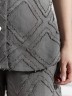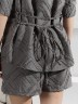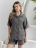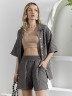 Костюм женский из фактурного полотна, свободный, состоящий из блузки и шорт. Блузка со спущенной линией плеч, с отложным воротником, застежкой на пуговицы, фигурной линией низа, рукавами средней длины, закрывающими локти. В боковых швах сорочки расположены шлевки со съемным поясом. Шорты с боковыми карманами, на притачном поясе с отстроченной эластичной тесьмой.