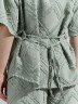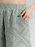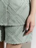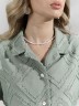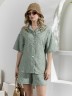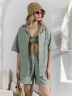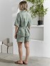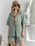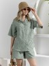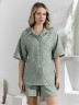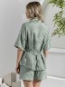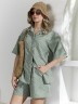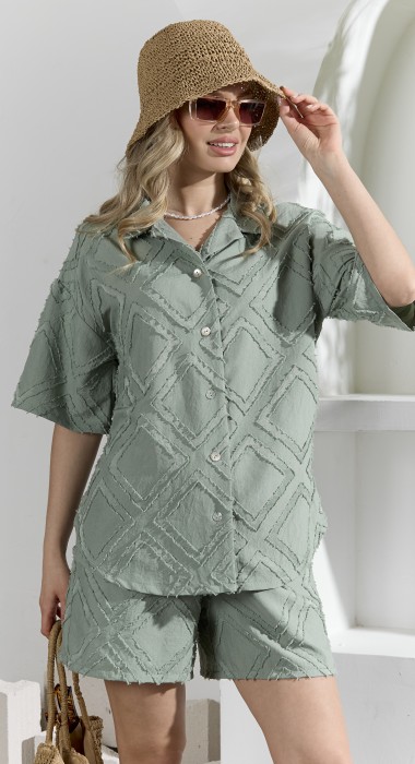 Костюм женский из фактурного полотна, свободный, состоящий из блузки и шорт. Блузка со спущенной линией плеч, с отложным воротником, застежкой на пуговицы, фигурной линией низа, рукавами средней длины, закрывающими локти. В боковых швах сорочки расположены шлевки со съемным поясом. Шорты с боковыми карманами, на притачном поясе с отстроченной эластичной тесьмой.