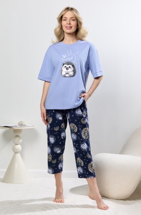 Костюм женский из плотного гладкокрашеного трикотажного полотна "кулирка", состоящий из футболки и шорт. Футболка - свободного покроя, с удлиненными плечевым и швами, короткими втачными рукавами и горловиной овальной формы, обработанной втачной планкой. В нижней части переда слева настрочен декоративный элемент прямоугольной формы. По горловине проложена отделочная строчка. Шорты - классического покроя, на притачном поясе с эластичной тесьмой внутри и карманами в боковых швах. Для регулирования степени прилегания шорт по талии в пояс вставлен шнурок, продетый через два отверстия в соединительных швах в центре пояса.