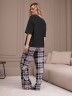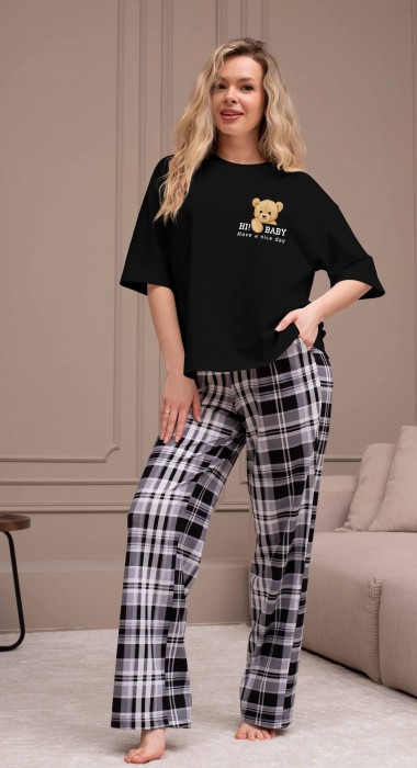 Костюм женский из трикотажного полотна "кулирка" в комбинации двух видов: гладкокрашеного и набивного с тематическим рисунком, состоящий из футболки и брюк. Футболка из гладкокрашеного полотна, свободного силуэта, со спущенной линией плеч и втачными короткими рукавами, горловиной овальной формы, обработанной втачной планкой и отделочной строчкой. В центре переда - принт, выполненгный в технике шелкографии. Брюки из полотна с набивным рисунком длинные, прямые, на притачном поясе с эластичной тесьмой внутри и карманами в боковыых швах.