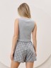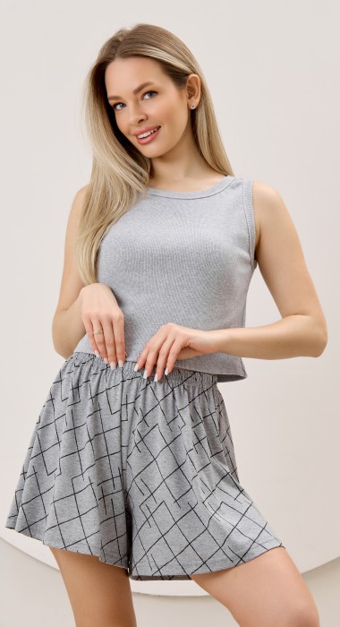 Костюм молодежный из трикотажного полотна двух видов: «кашкорсе» и меланжированной «кулирки», состоящий из майки и шорт. Майка – из гладкокрашеного полотна «кашкорсе», средней длины, с горловиной овальной формы. Срезы пройм и горловина окантованы широкой окантовкой из основного материала.Шорты – из меланжированого полотна «кулирка» с набивным рисунком, средней длины, широкие, с эластичной тесьмой по талии.