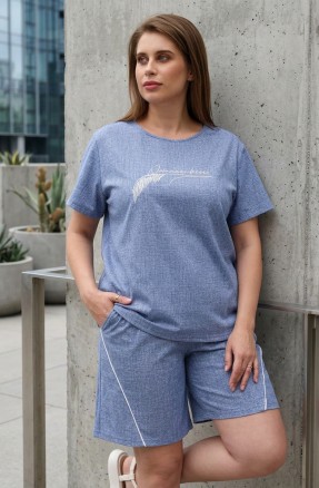 Костюм женский из трикотажного гладкокрашенного меланжированого полотна «кулирка», состоящий из футболки и брюк.Футболка - классического покроя, с короткими втачными рукавами, горловиной V- образной формы и принтом на полочке, выполненным в технике «шелкографии». Горловина обработана втачной планкой из основного материала.Брюки - свободного покроя, с карманами в боковых швах, на притачном поясе с эластичной тесьмой внутри.