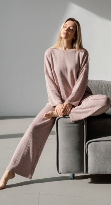 Костюм молодежный из гладкокрашеного фактурного трикотажного полотна, состоящий из джемпера и брюк. Джемпер – прямого силуэта, свободная, с цельнокроеными длинными рукавами , горловиной овальной формы, обработанной втачной планкой.Брюки – свободного кроя, длинные, с эластичной тесьмой по талии и шнурком, продетым в две обметанные петли.