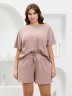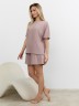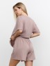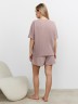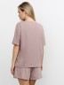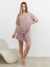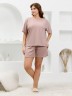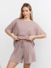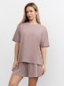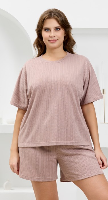 Костюм молодежный из гладкокрашеного фактурного трикотажного полотна, состоящий из футболки и шорт. Футболка – свободного кроя, с цельнокроеными рукавами, горловиной овальной формы, обработанной втачной планкой.Шорты – средней длины, свободные, с эластичной тесьмой по талии и шнурком, продетым в две обметанные петли.