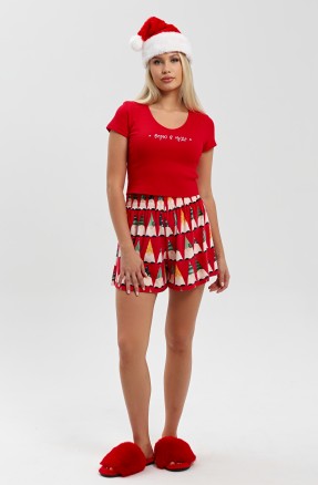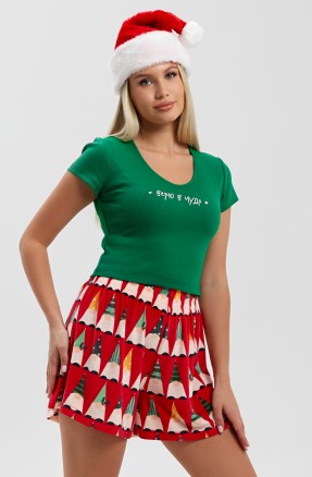 Костюм из трикотажного полотна «кулирка» в комбинации двух видов: гладкокрашеного «меланжированого» и с набивным рисунком, состоящий из футболки и бридж.Футболка – из полотна с набивным рисунком, с короткими цельнокроеными рукавами, горловиной овальной формы, окантованной основным материалом и разрезами по боковым швам. Бриджи-велосипедки – из «меланжированого» полотна, классического покроя, с эластичной тесьмой по талии.