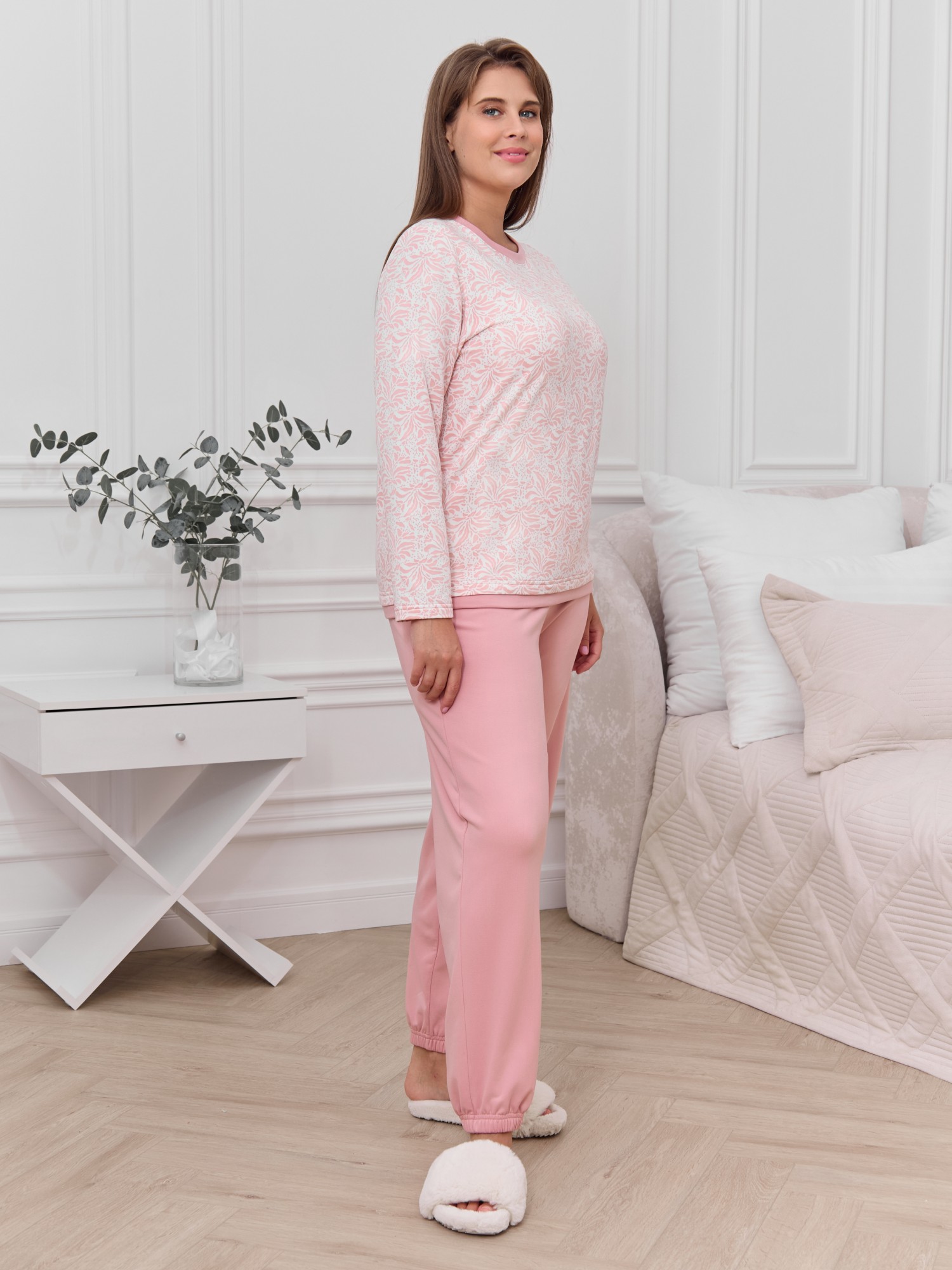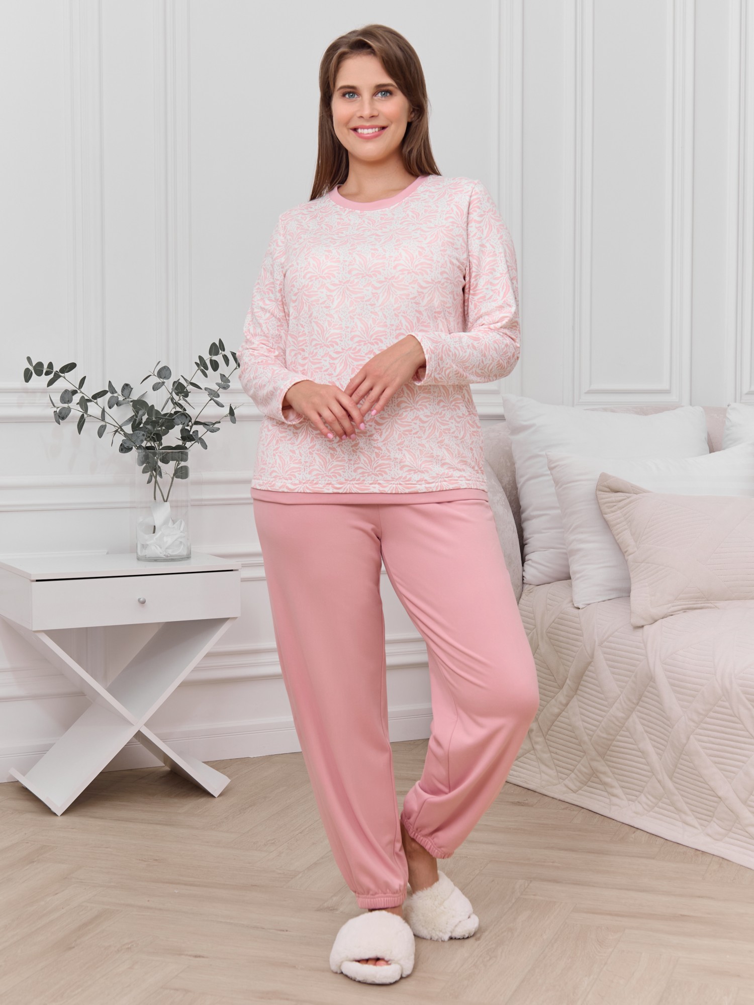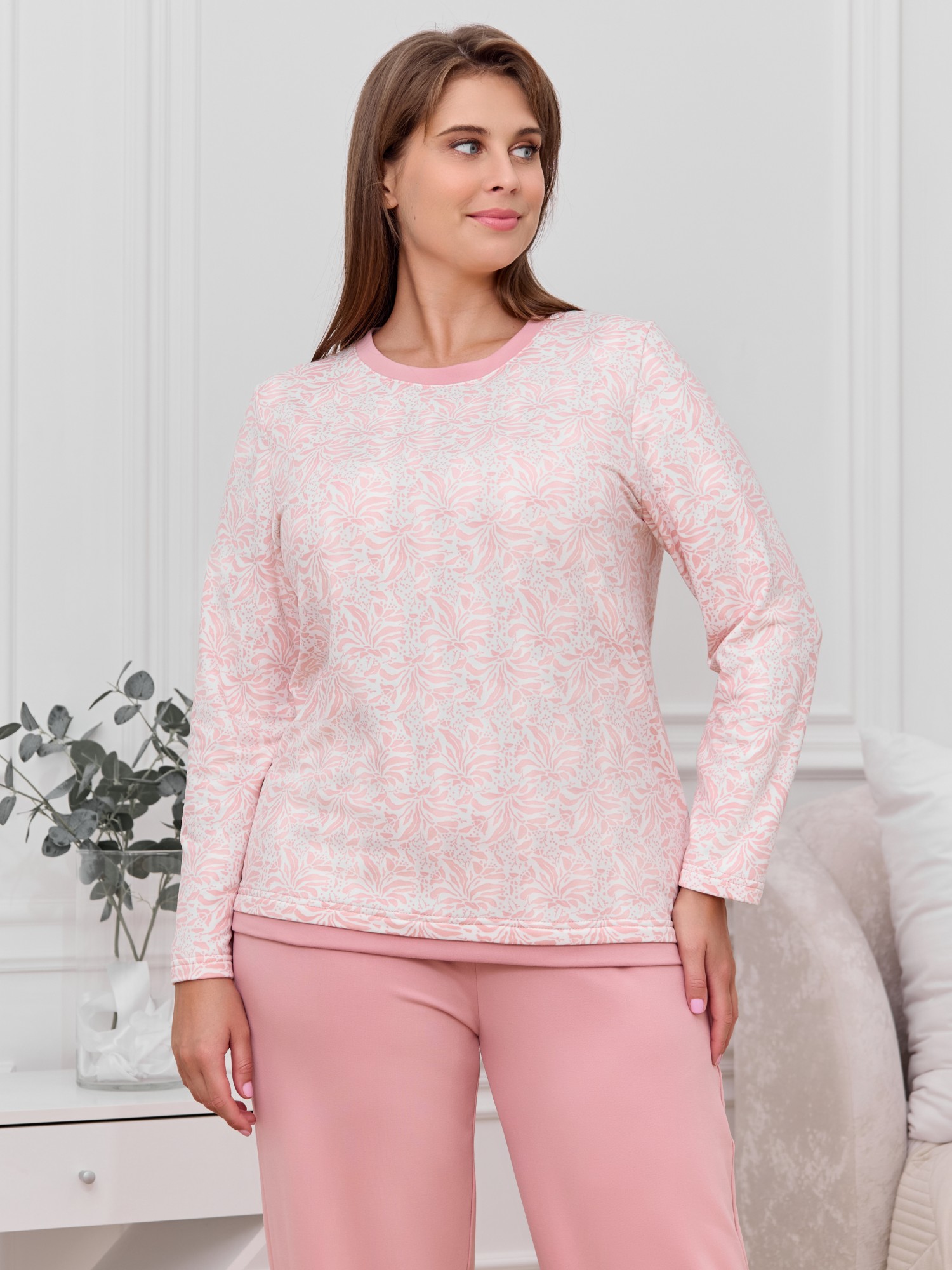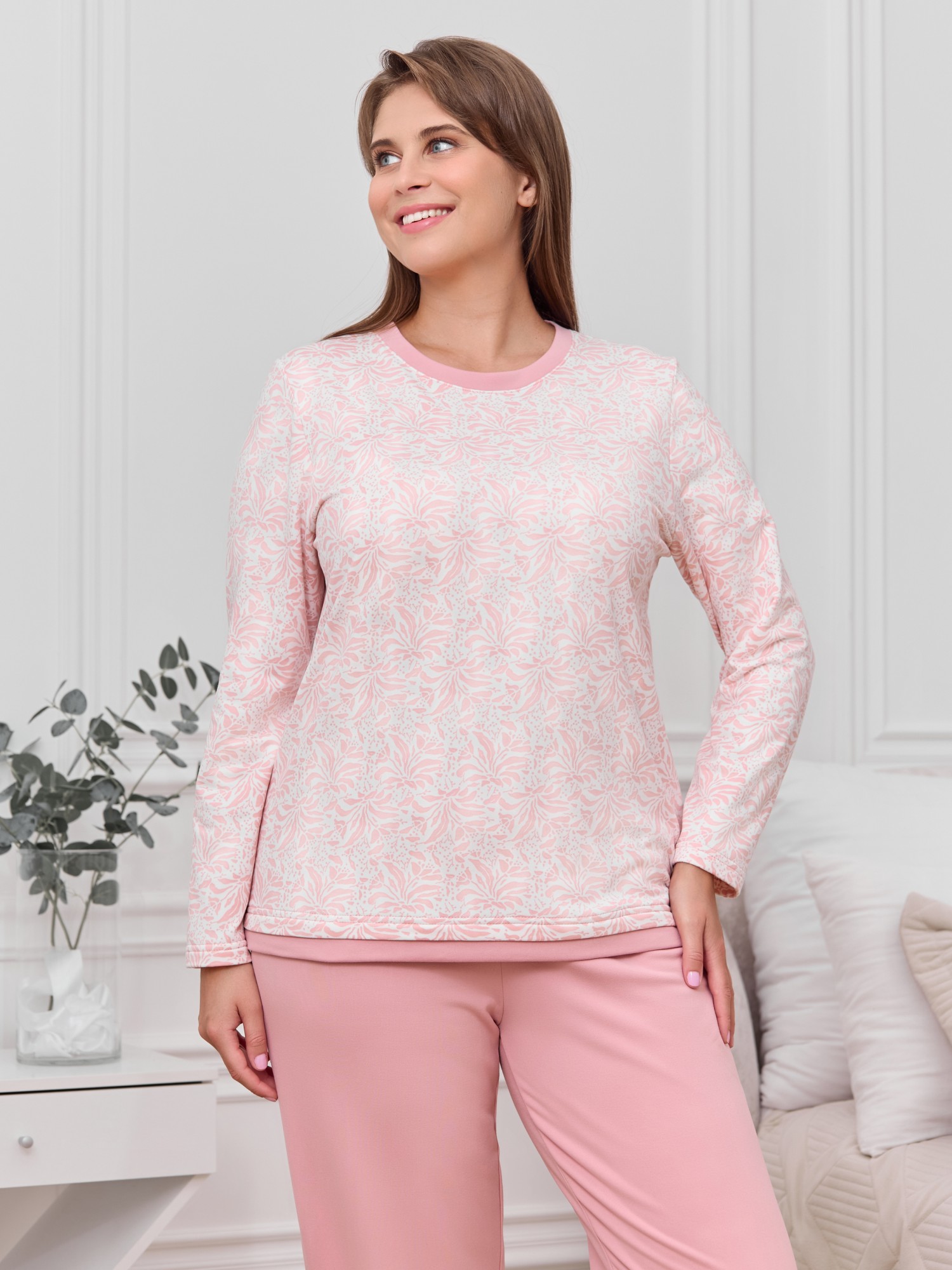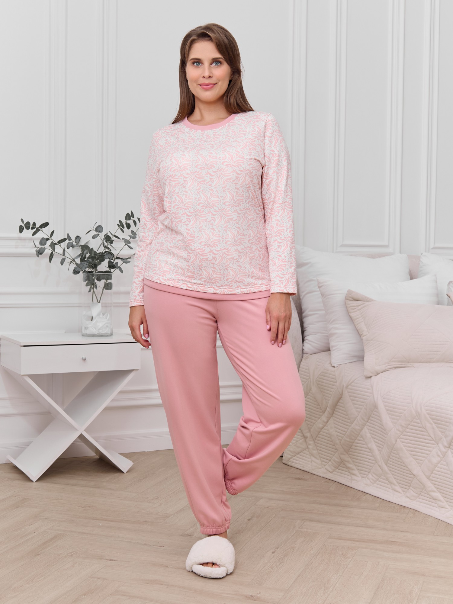 Пижама женская из трикотажного полотна «микрофлис» в комбинации двух видов:с набивным рисунком и гладкокрашеного в единой цветовой гамме, состоящая из футболки и брюк. Футболка - из полотна с набивным рисунком, классического покроя, с длинными втачными рукавами, горловиной овальной формы, обработанной втачной планкой. Низ изделия, горловина обработаны притачными планками из контрастного материала.Брюки – свободного покроя, с эластичной тесьмой по талии и нижним срезам.