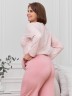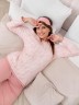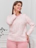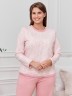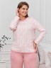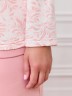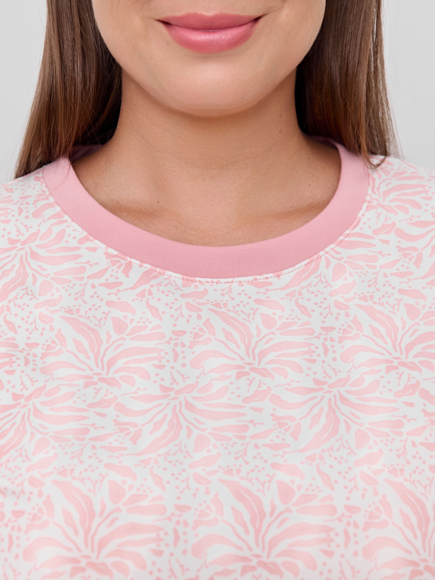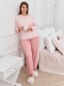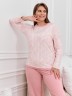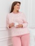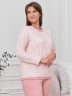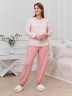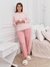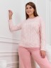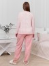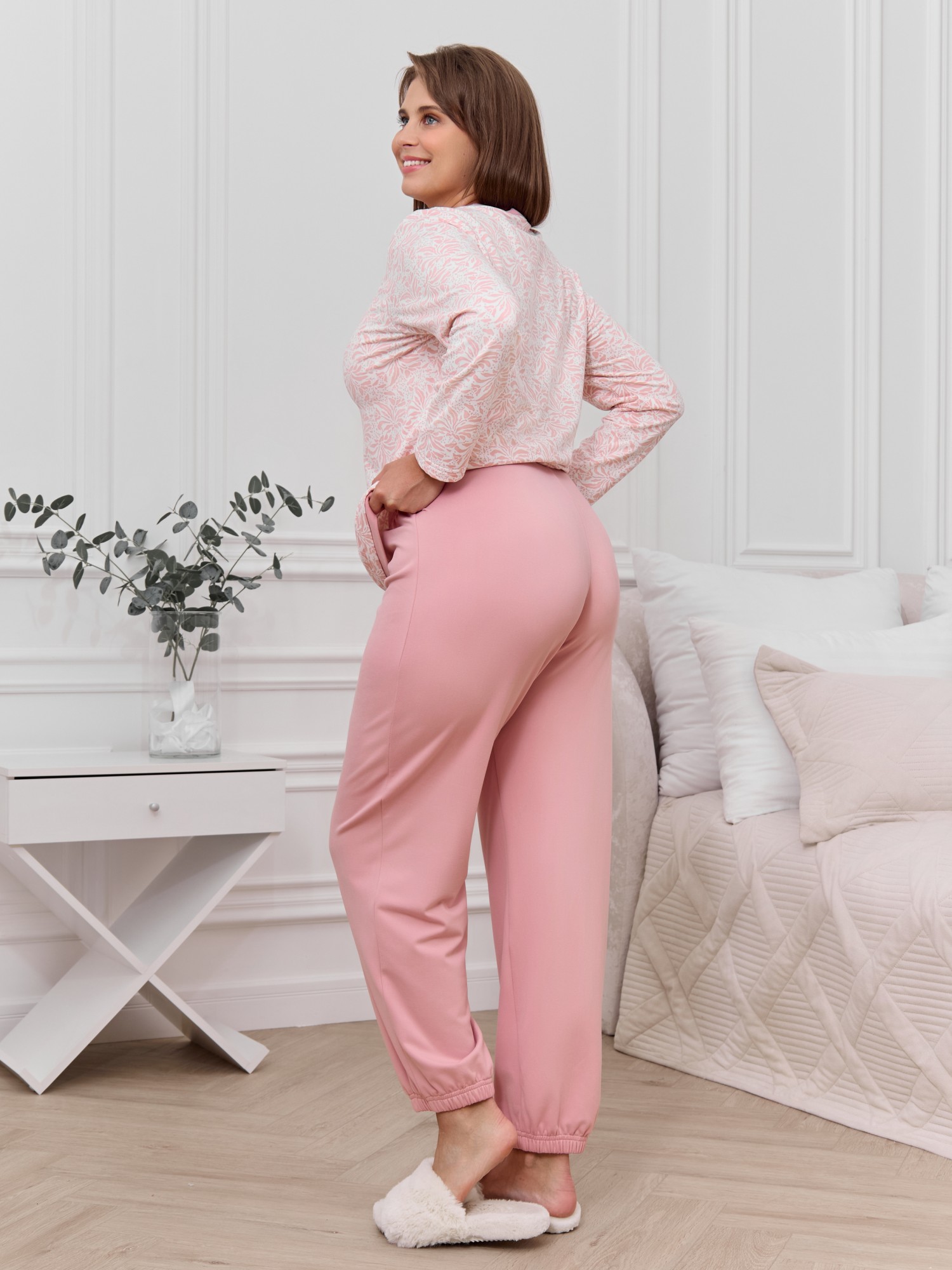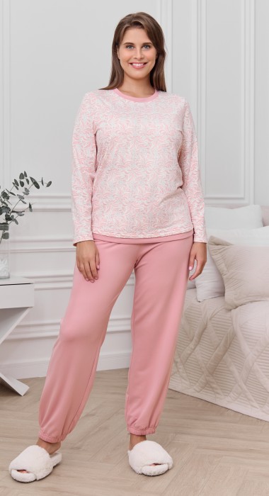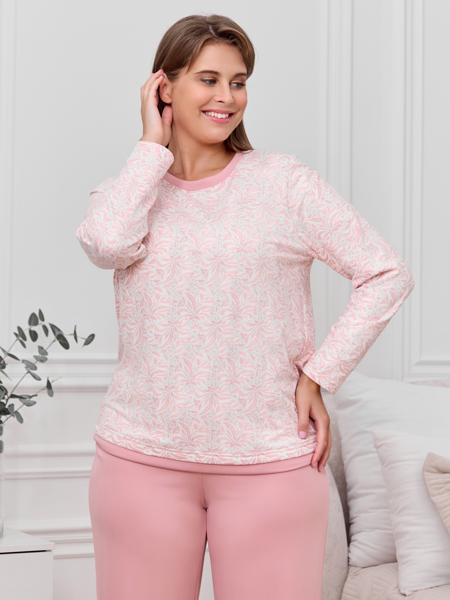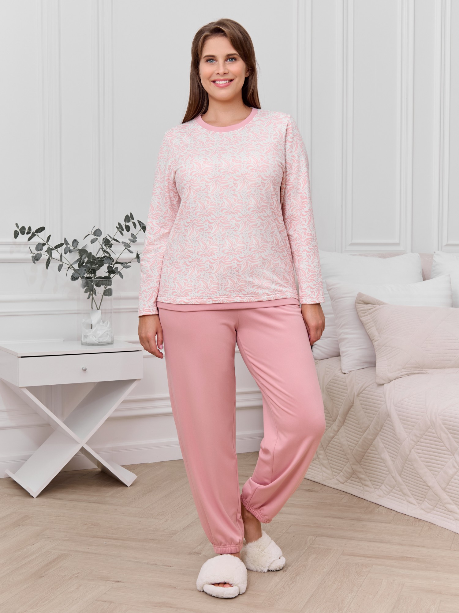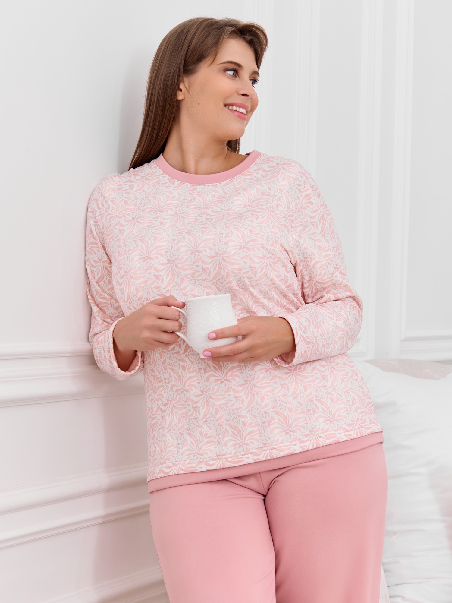 Пижама женская из трикотажного полотна «микрофлис» в комбинации двух видов:с набивным рисунком и гладкокрашеного в единой цветовой гамме, состоящая из футболки и брюк. Футболка - из полотна с набивным рисунком, классического покроя, с длинными втачными рукавами, горловиной овальной формы, обработанной втачной планкой. Низ изделия, горловина обработаны притачными планками из контрастного материала.Брюки – свободного покроя, с эластичной тесьмой по талии и нижним срезам.