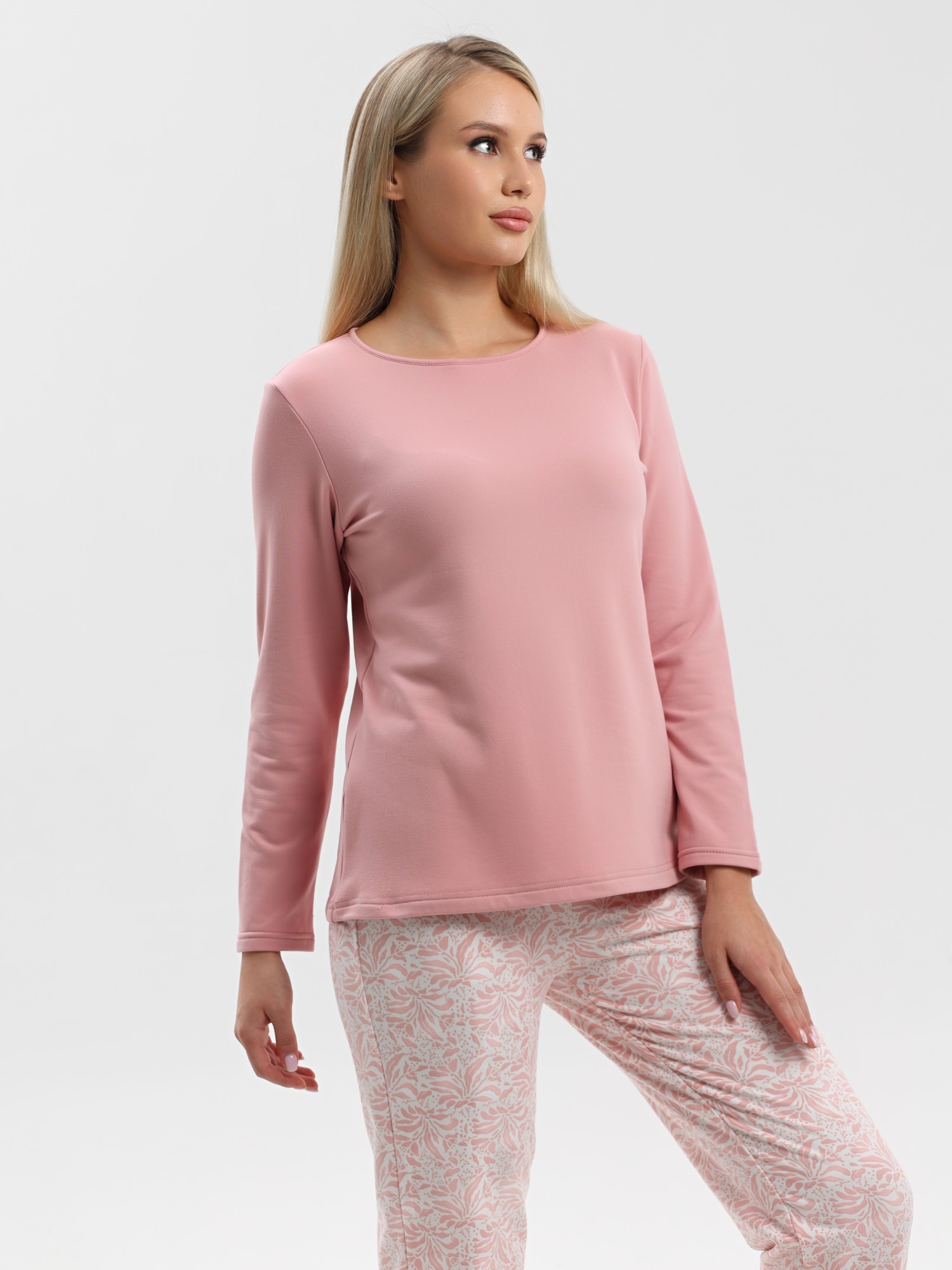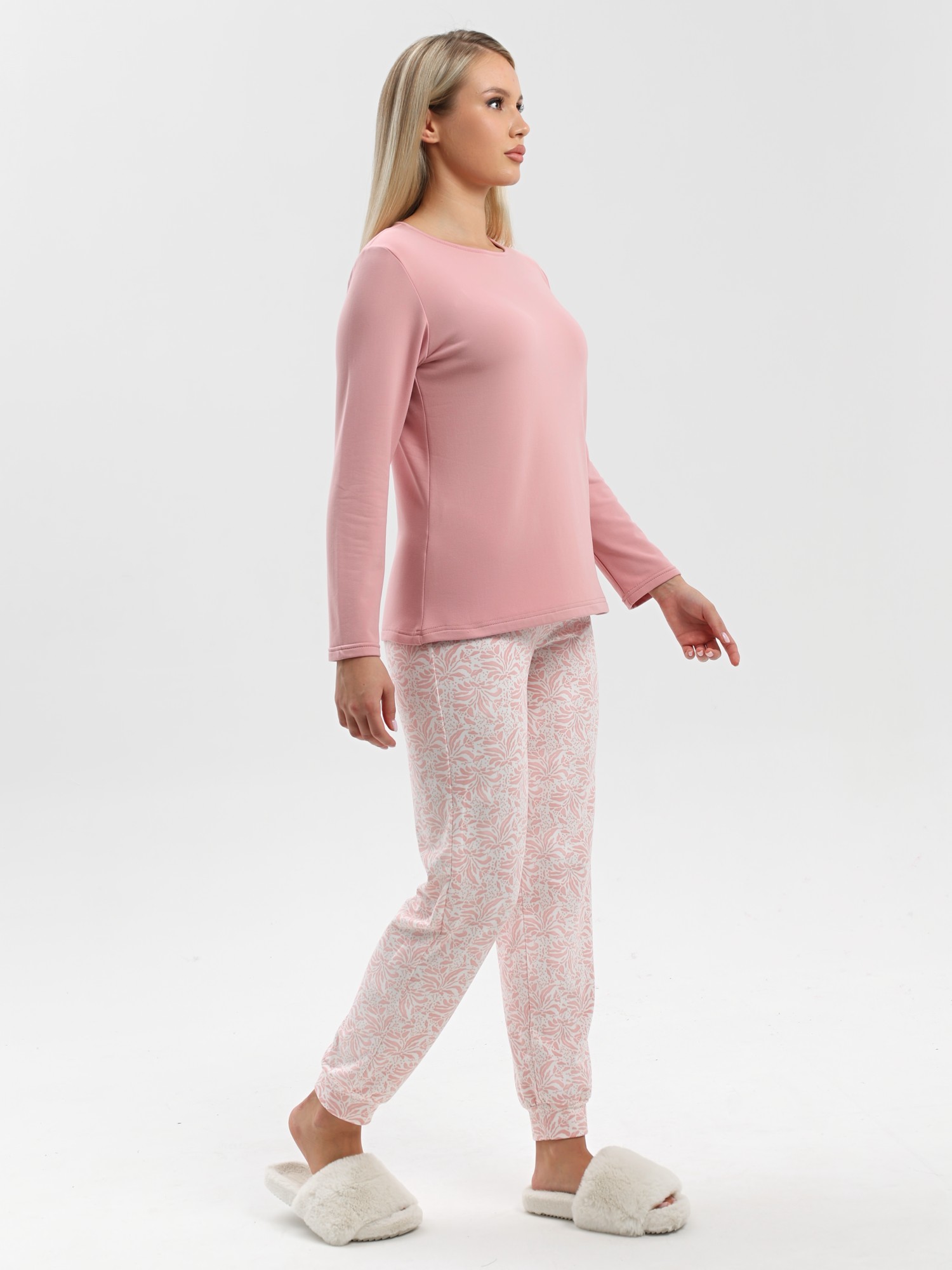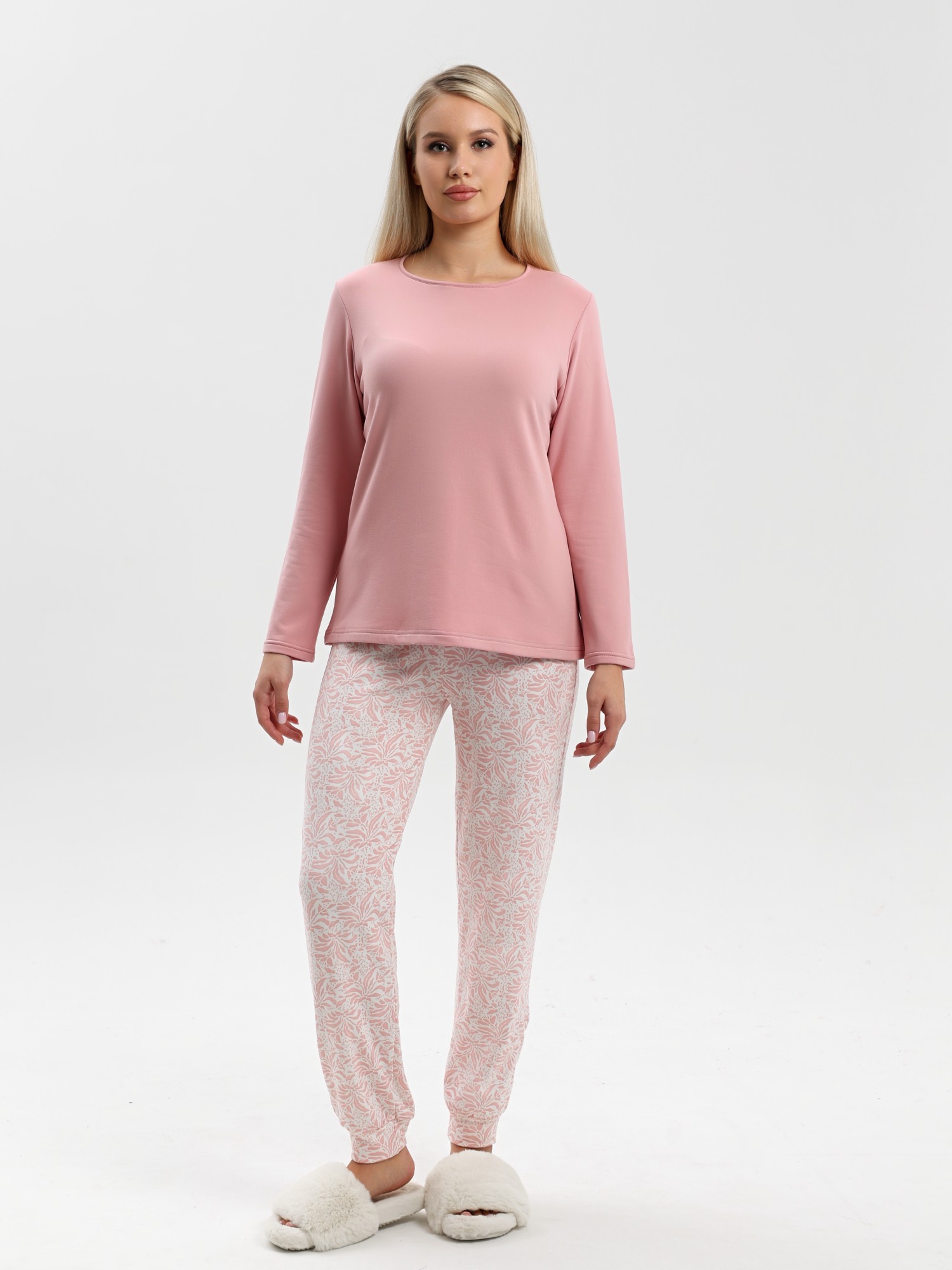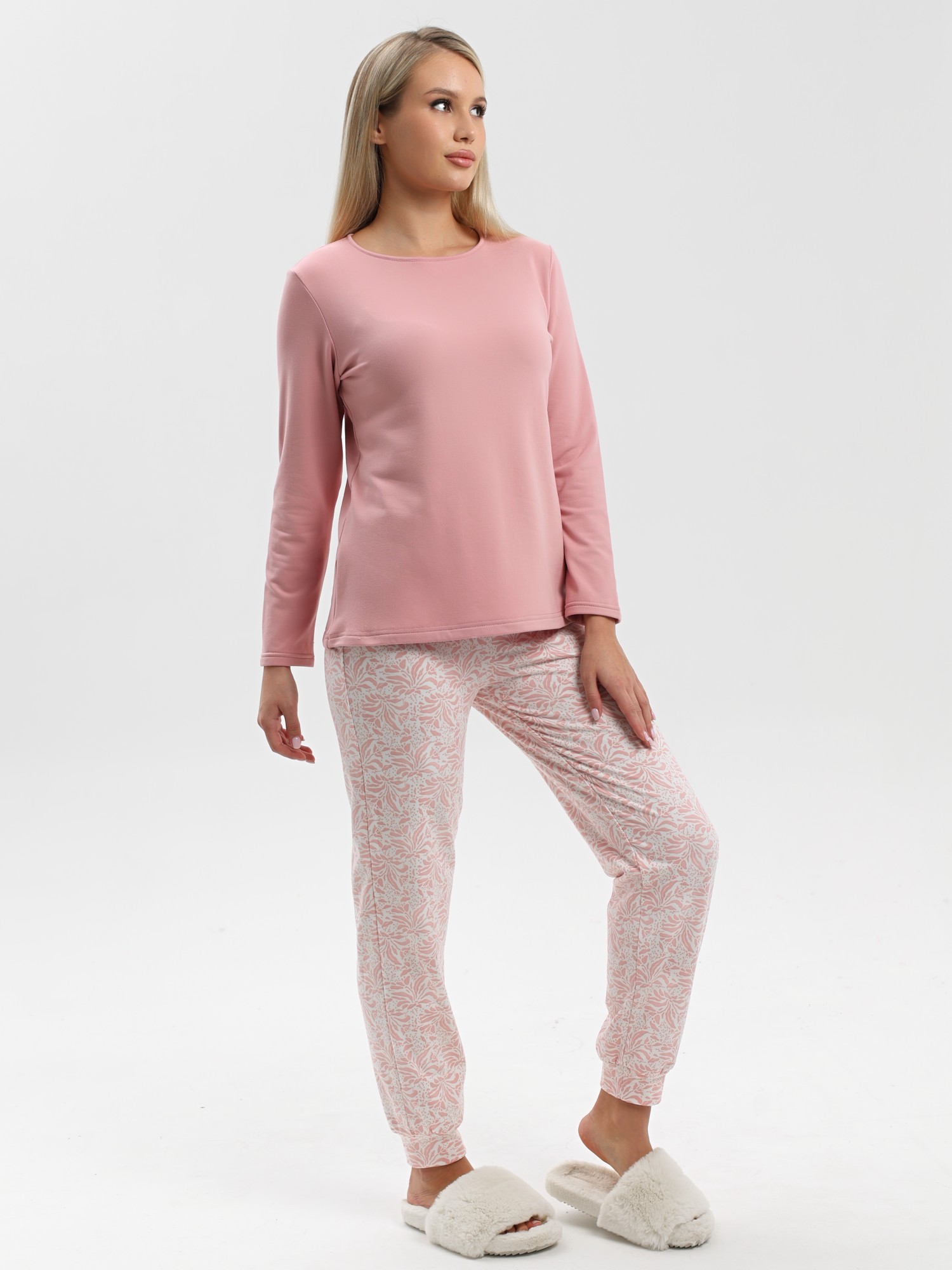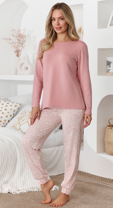 Пижама молодежная из трикотажного полотна «микрофлис» в комбинации двух видов: с набивным рисунком и гладкокрашеного в единой цветовой гамме, состоящая из футболки и брюк. Футболка - из гладкокрашенного полотна, классического покроя, с длинными втачными рукавами, горловиной овальной формы, окантованной основным материалом.Брюки – из полотна с набивным рисунком, свободного покроя, с эластичной тесьмой по талии и притачными манжетами по нижним срезам.