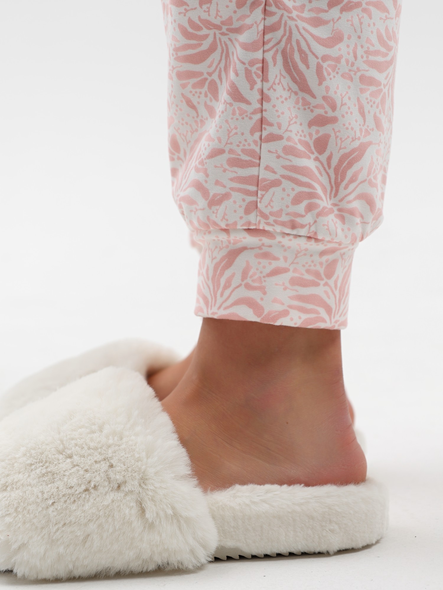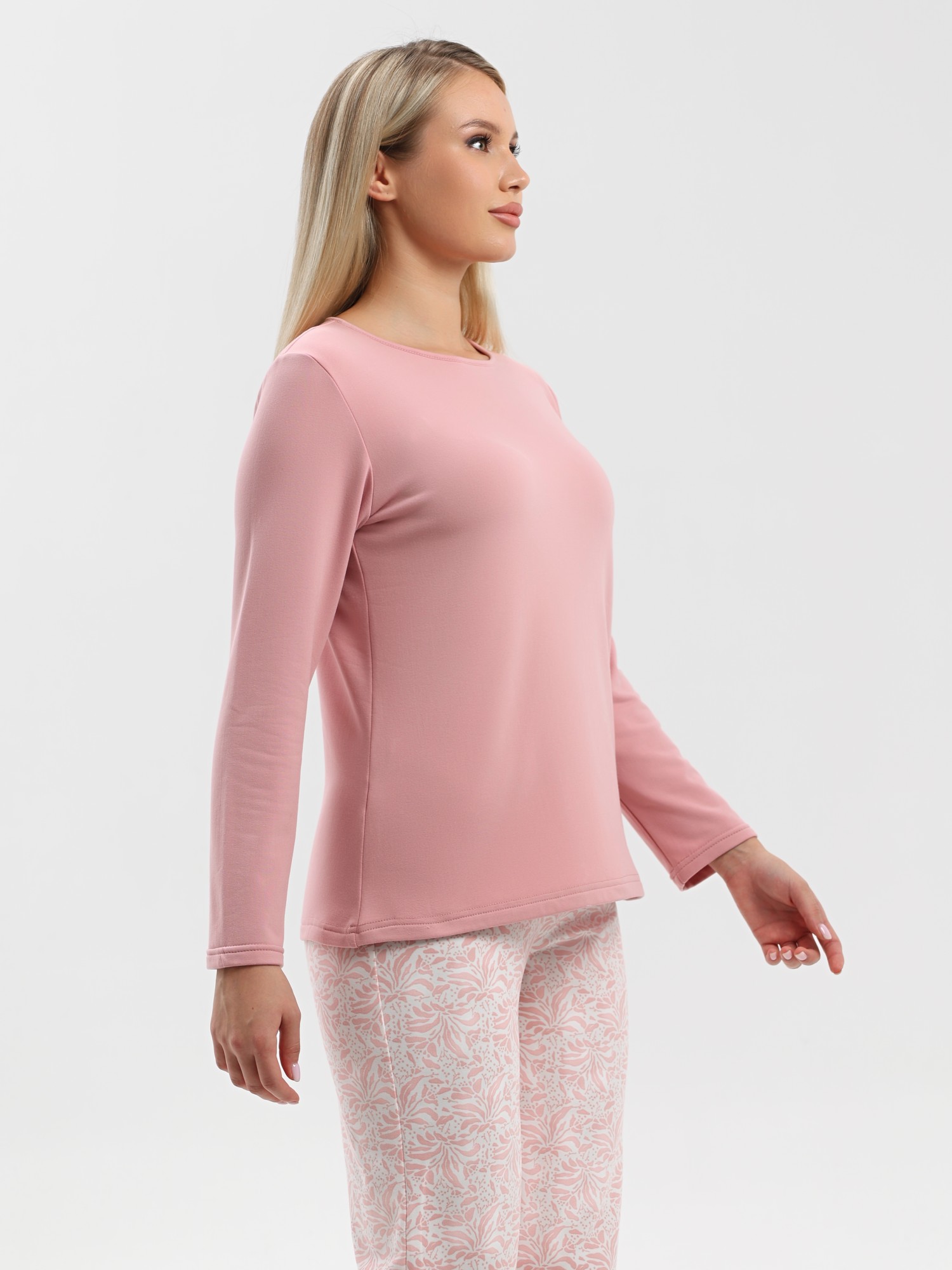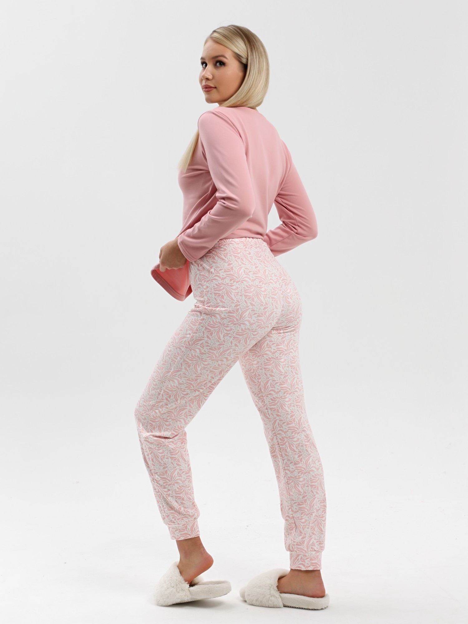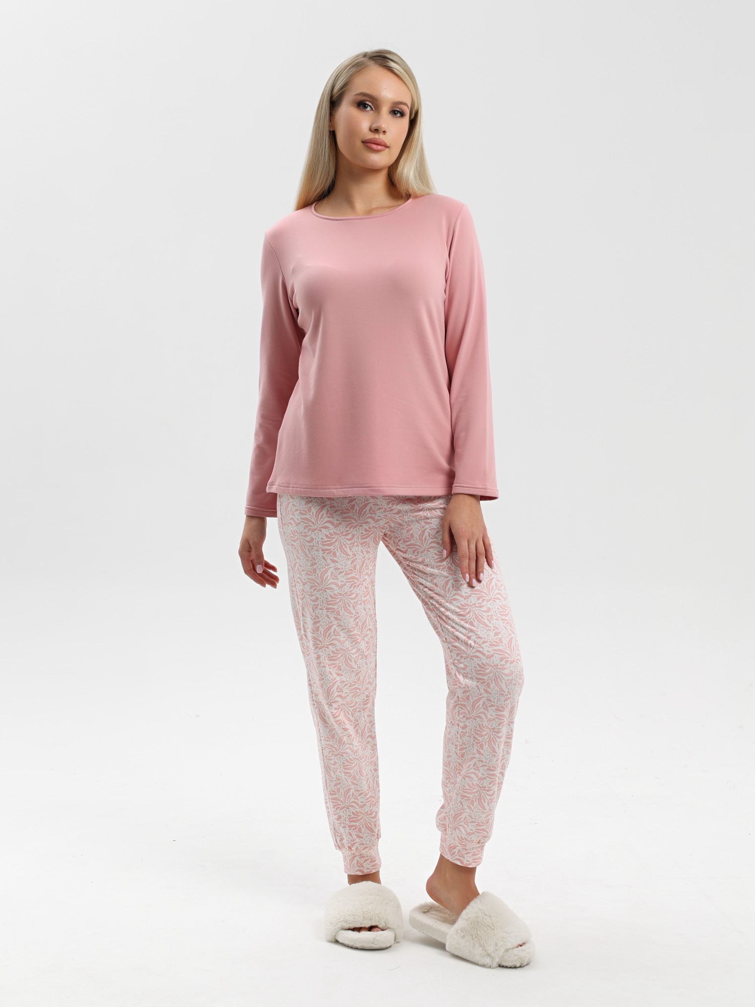 Пижама молодежная из трикотажного полотна «микрофлис» в комбинации двух видов: с набивным рисунком и гладкокрашеного в единой цветовой гамме, состоящая из футболки и брюк. Футболка - из гладкокрашенного полотна, классического покроя, с длинными втачными рукавами, горловиной овальной формы, окантованной основным материалом.Брюки – из полотна с набивным рисунком, свободного покроя, с эластичной тесьмой по талии и притачными манжетами по нижним срезам.