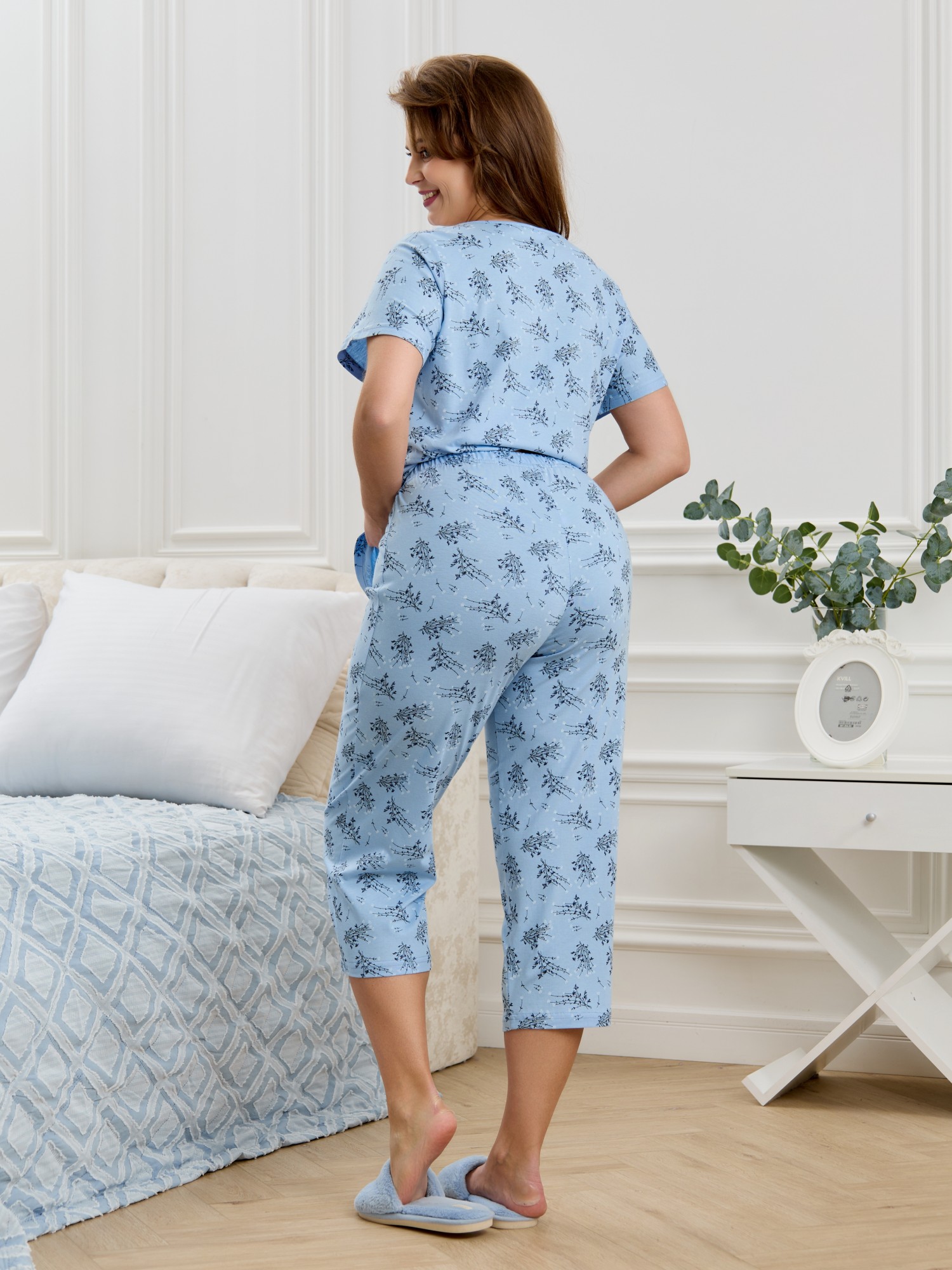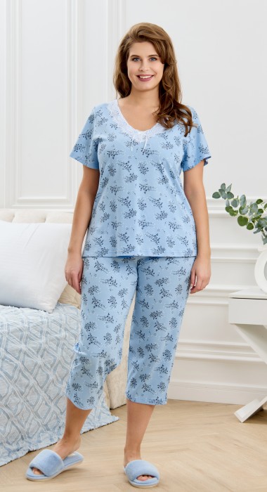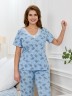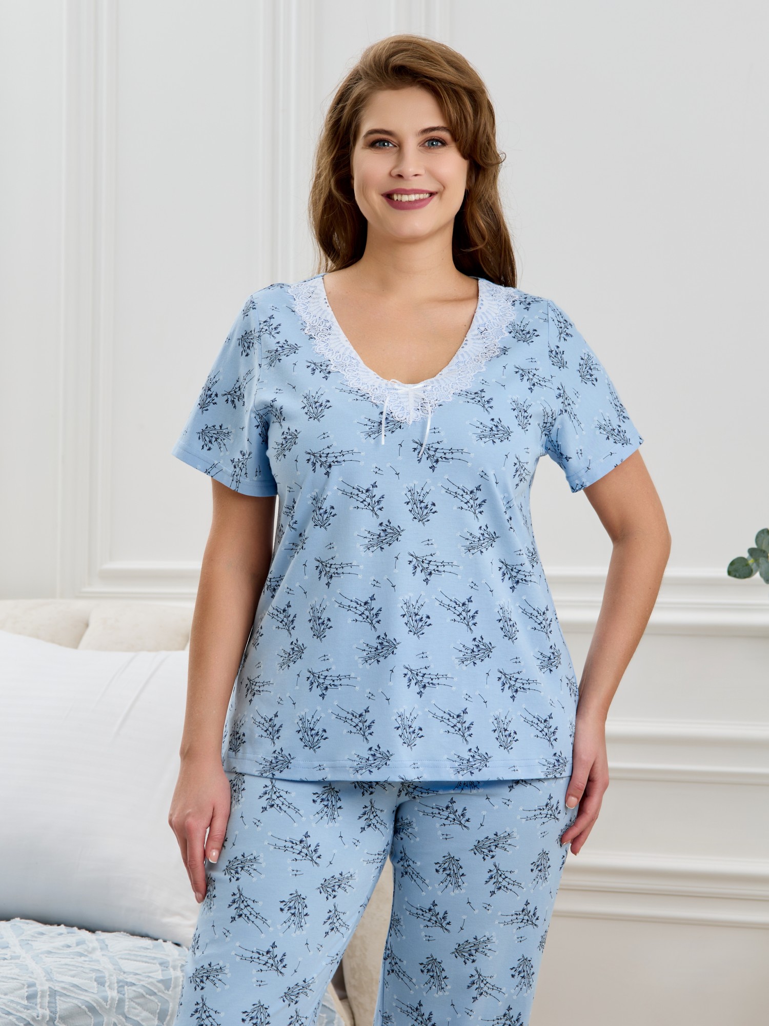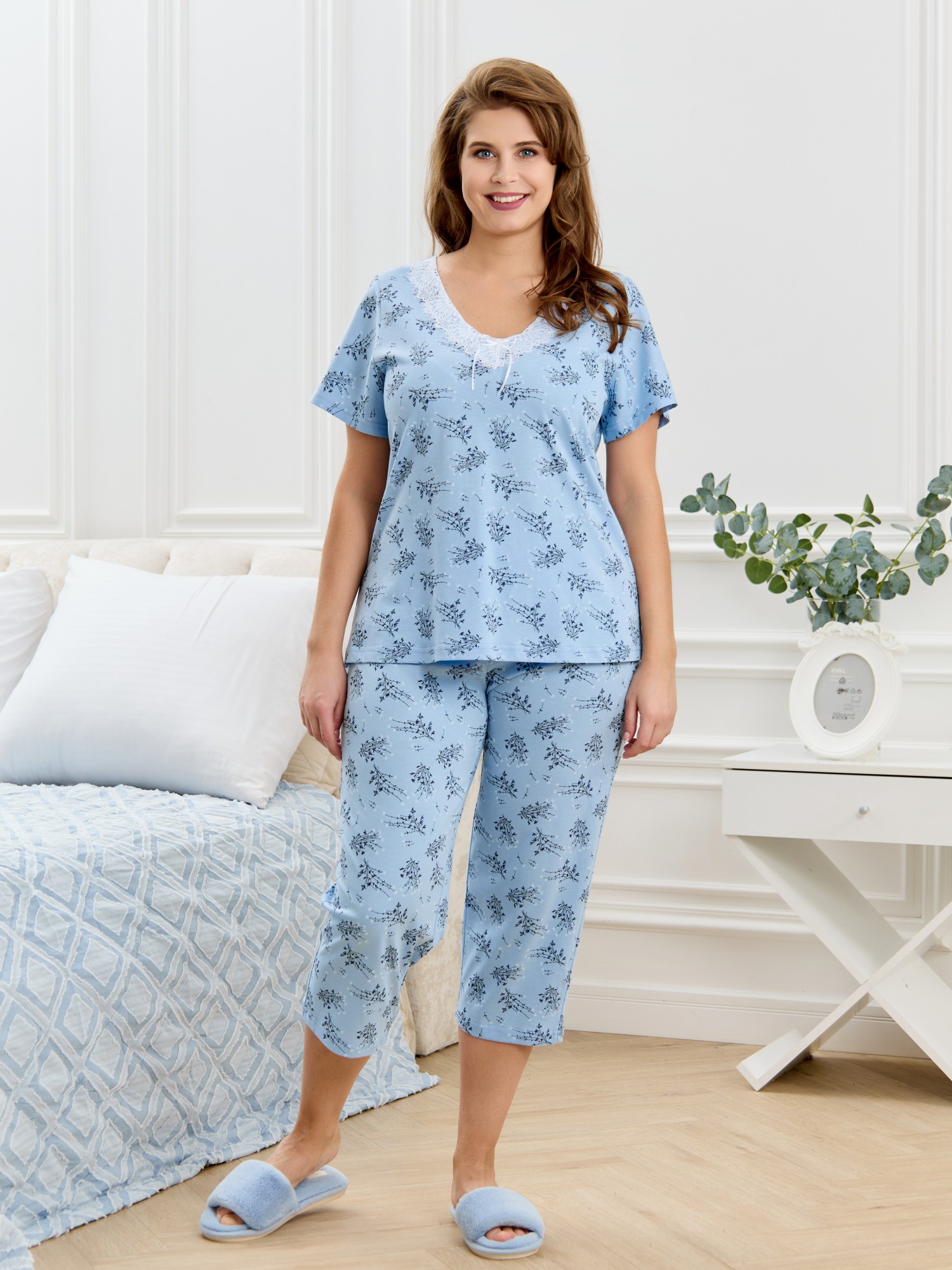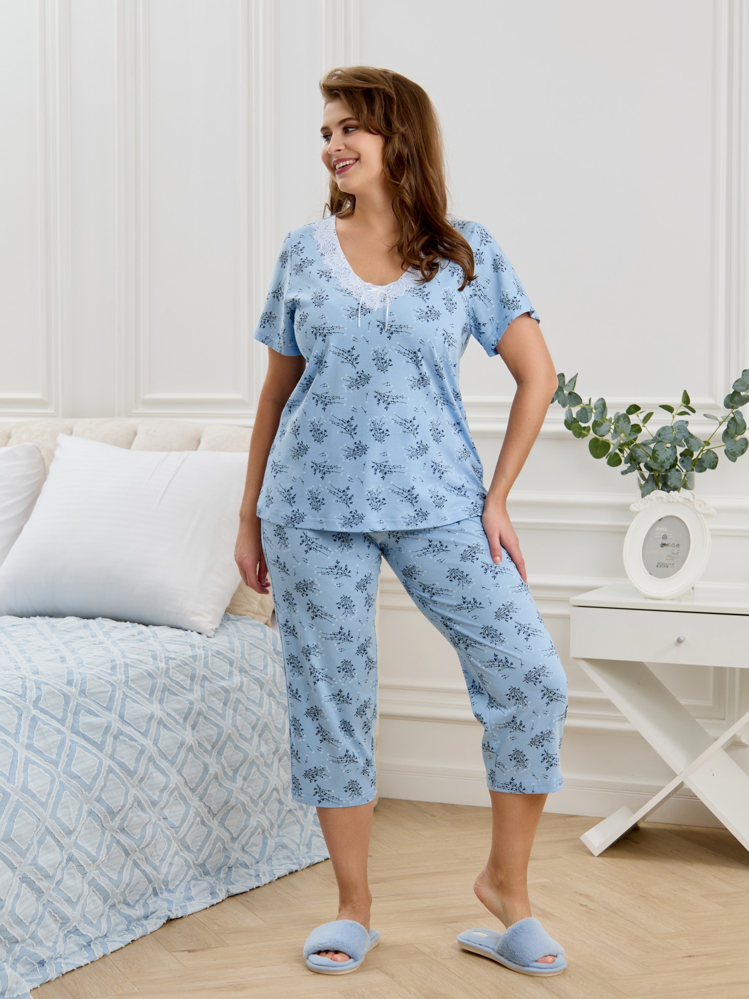 Пижама женская из трикотажного полотна «кулирка» с набивным рисунком, состоящая из футболки и бридж. Футболка прямого кроя, с короткими втачными рукавами. Горловина V- образной формы, обработана кружевом с фестонным краем, по центру настрочен декоративный бантик из узкой атласной тесьмы.Бриджи свободные, длиной до середины икры, с эластичной тесьмой по талии.