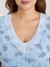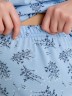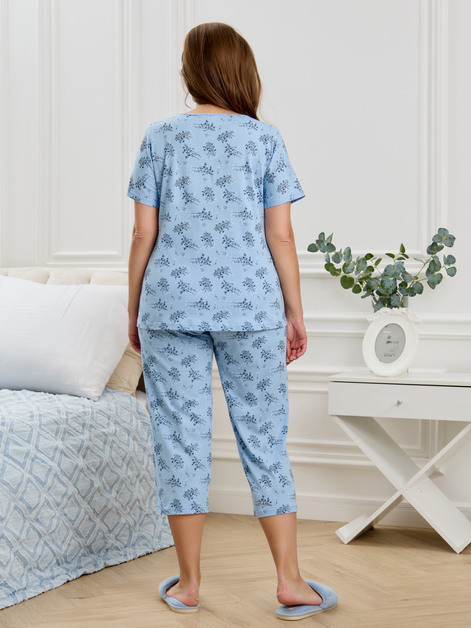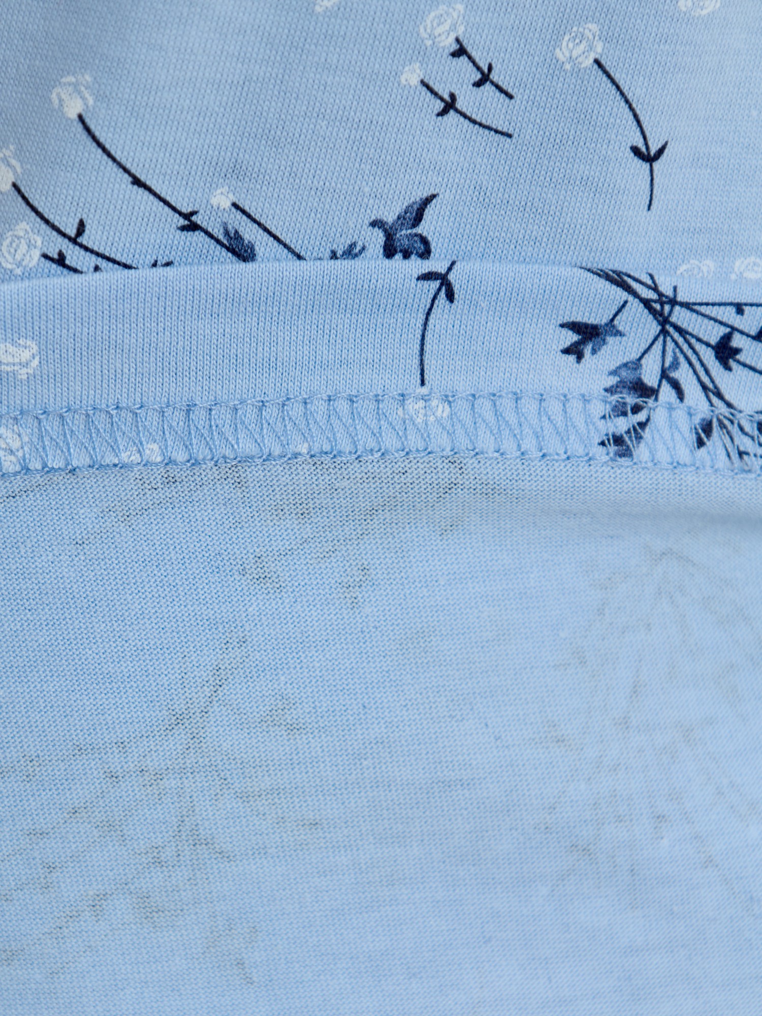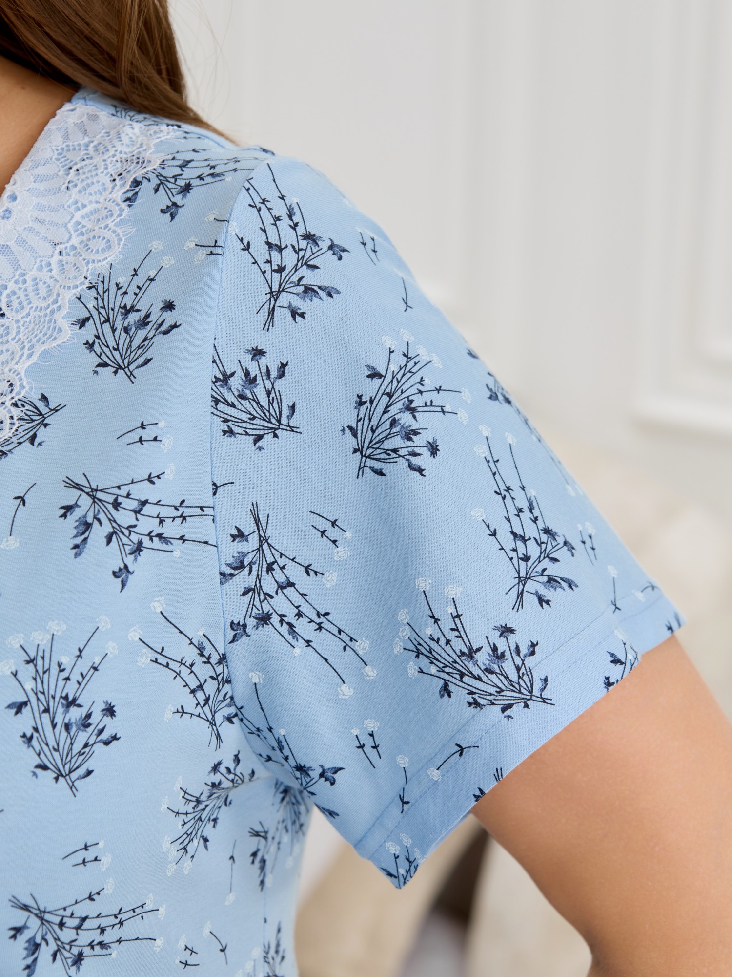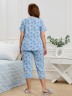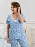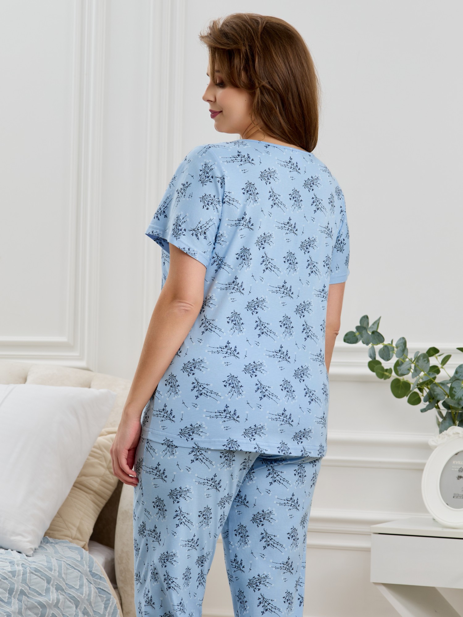 Пижама женская из трикотажного полотна «кулирка» с набивным рисунком, состоящая из футболки и бридж. Футболка прямого кроя, с короткими втачными рукавами. Горловина V- образной формы, обработана кружевом с фестонным краем, по центру настрочен декоративный бантик из узкой атласной тесьмы.Бриджи свободные, длиной до середины икры, с эластичной тесьмой по талии.