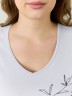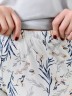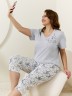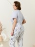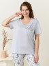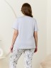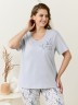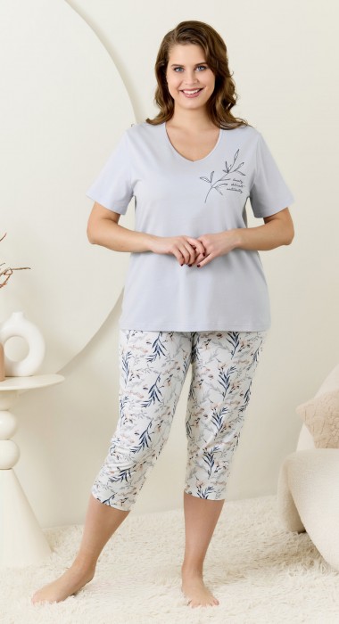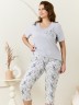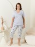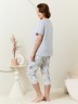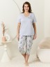 Пижама женская из трикотажного полотна «кулирка» в комбинации двух видов полотен: гладкокрашенного и с набивным рисунком, состоящая из футболки и бриджей. Футболка – из гладкокрашенного полотна, классического покроя, с короткими втачными рукавами, горловиной V-образной формы, окантованной основным материалом и принтом на полочке, выполненным в технике шелкографии.Бриджи – из полотна с набивным рисунком, свободного покроя, на притачном поясе с эластичной тесьмой внутри.