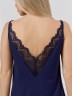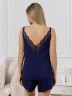 Пижама молодежная гладкокрашеного трикотажного вискозного полотна с отделкой кружевом, состоящая из топа и шорт. Топ - на узких бретелях, слегка расширенный книзу. V-образная горловина полочки и спинки отделана кружевными вставками треугольной формы. Проймы окантованы основным материалом. Шорты – свободные, средней длины, с эластичной тесьмой по талии.