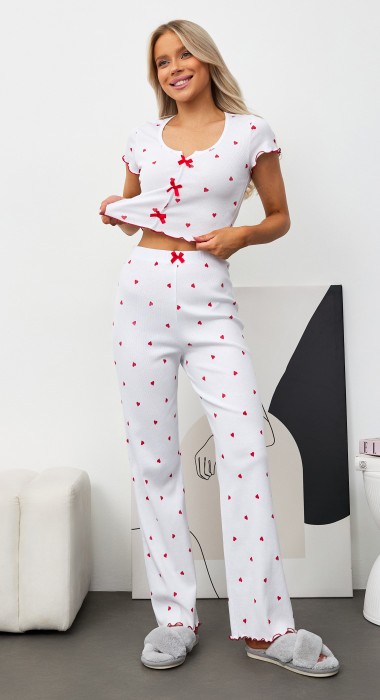 Пижама молодежная из трикотажного полотна «кашкорсе» с набивным рисунком состоящая из майки-топа и брюк. Майка-топ – с короткими втачными рукавами, небольшим разрезом по горловине, окантованным основным материалом. Левая и правая окантовочным швом и украшены тремя декоративными бантиками из атласной ленты. Нижний срез рукавов и низ изделия обработаны узкой обметочной строчкой контрастного цвета, создающей красивый волнистый край.Брюки – свободные, с эластичной тесьмой по талии, расширенные книзу. Нижние срезы брюк обработаны узкой обметочной строчкой контрастного цвета, создающей красивый волнистый край.