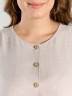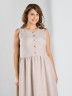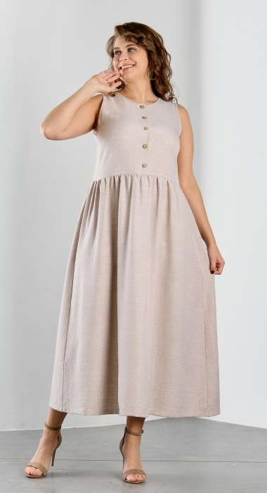 Платье женское из гладкокрашеного тканого полотна, отрезное по линии талии, длинное, без рукавов, с горловиной овальной формы и центральной бортовой застежкой по лифу на петли и пуговицы. Юбка присборена по шву стачивания с лифом, горловина и проймы окантованы основным материалом.