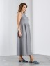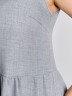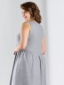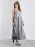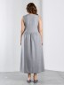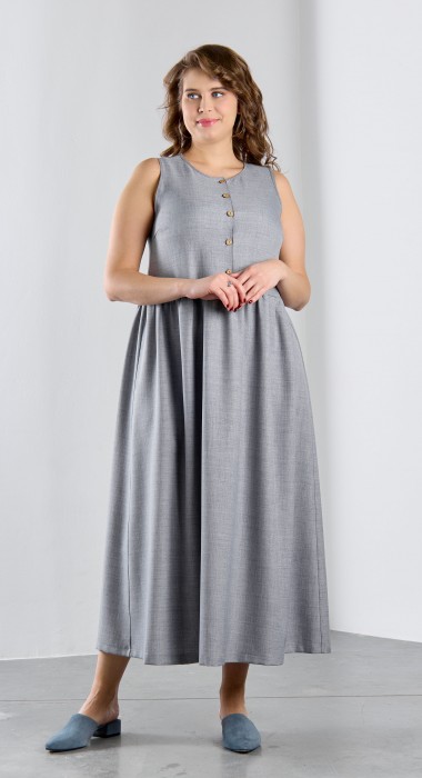 Платье женское из гладкокрашеного тканого полотна, отрезное по линии талии, длинное, без рукавов, с горловиной овальной формы и центральной бортовой застежкой по лифу на петли и пуговицы. Юбка присборена по шву стачивания с лифом, горловина и проймы окантованы основным материалом.