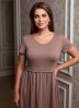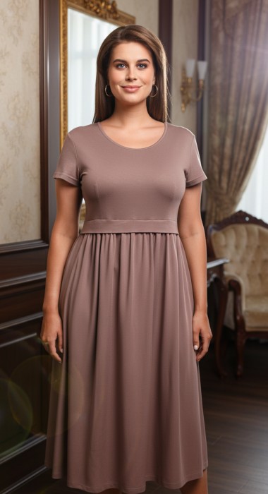 Платье женское отрезное по линии талии в комбинации двух видов гладкокрашеной ткани, в единой цветовой гамме: вискозного полотна (лиф) и плательной штапельной ткани (юбка), удлиненное, с короткими втачными рукавами, горловиной овальной формы, окантованной основным материалом и декоративной планкой в шве соединения лифа с юбкой. Юбка по шву соединения с лифом присборена.