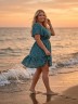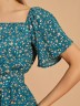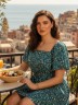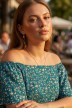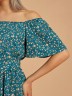 Платье молодежное из тканого полотна «штапель» с набивным рисунком, длиной до колена, свободного покроя, отрезное по линии талии, вытачками в области груди, с широкими рукавами на основе «реглан». Горловина прямоугольной формы – расширенная и углубленная. Рукава присборены по верхним срезам при помощи эластичной тесьмы в краевых швах. Верхние срезы спинки и полочек, образующие горловину, окантованы основным материалом. Юбка присборена по швам соединения с лифом с помощью эластичной тесьмы, понизу - оборка. Изделие комплектуется съемным поясом, завязывающимся на талии.