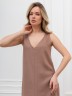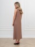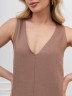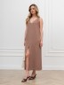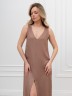 Платье женское из гладкокрашеного тканого полотна, свободное, слегка расширенное к низу, с глубоким V-образным вырезом горловины, обработанным внутренней обтачкой, без рукавов, с вытачками в области груди. Перед состоит из двух частей, в шве соединения деталей по центру длинный разрез.