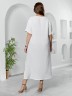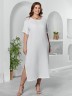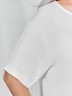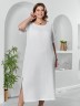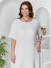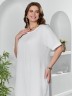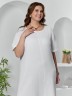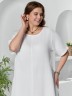 Платье женское из гладкокрашеного тканого полотна «муслин», прямого покроя, с горловиной овальной формы, короткими втачными рукавами. Полочка состоит из двух частей, в шве соединения деталей по центру – разрез, горловина окантована основным материалом.