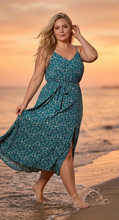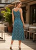 Сарафан молодежный из тканого полотна «штапель» с набивным рисунком, с углубленной V-образной горловиной, на узких бретелях, отрезное по линии талии, с расклешенной юбкой, собранной с помощью эластичной тесьмы. Горловина и проймы окантованы основным материалом. Переднее полотнище юбки из двух частей, в соединительном шве выполнен разрез. Изделие комплектуется съемным поясом, завязывающимся на талии.