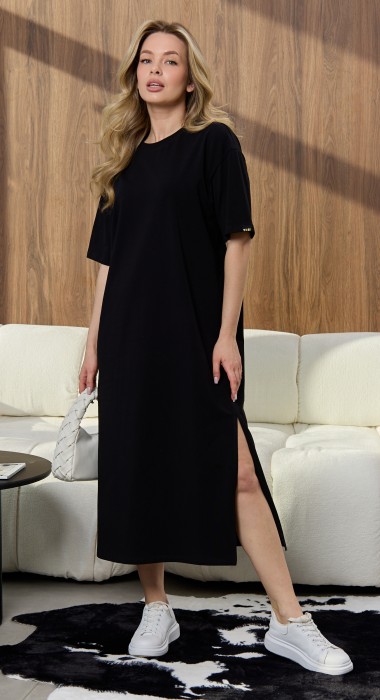 Туника женская из гладкокрашеного трикотажного полотна «кулирка» с лайкрой, прямого силуэта, со спущенной линией плеча, короткими втачными рукавами, горловиной овальной формы, обработанной втачной планкой из основного материала, с разрезами в боковых швах. Левый рукав дополнен декоративным элементом.