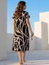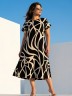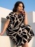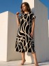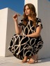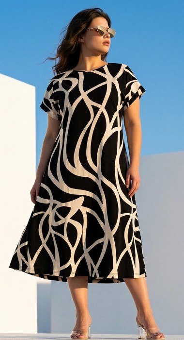 Платье женское из трикотажного полотна «кулирка» с набивным рисунком, длинное, расширенное к низу, с горловиной овальной формы окантованной основным материалом, короткими втачными рукавами, обработанными манжетами.