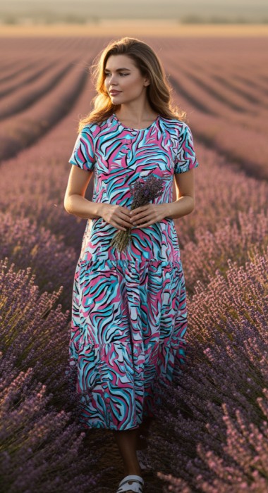 Платье из трикотажного полотна «кулирка» с набивным рисунком, с короткими втачными рукавами, горловиной фигурной формы (сзади V- образная, спереди – овальная), с двумя завязывающимися концам, являющимися продолжением окантовки горловины переда. Юбка – широкая отрезная по линии бедер из двух ярусов, верхний срез присборен.