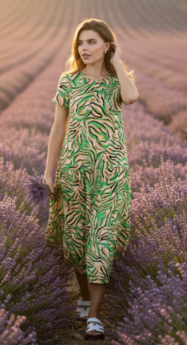 Платье из трикотажного полотна «кулирка» с набивным рисунком, с короткими втачными рукавами, горловиной фигурной формы (сзади V- образная, спереди – овальная), с двумя завязывающимися концам, являющимися продолжением окантовки горловины переда. Юбка – широкая отрезная по линии бедер из двух ярусов, верхний срез присборен.