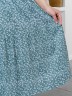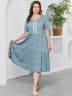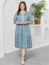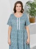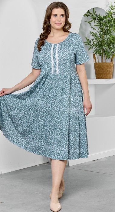 Платье женское из трикотажного полотна "кулирка" с набивным рисунком, свободного кроя, отрезное по линии талии, с короткими втачными рукавами, горловиной овальной формы окантованной основным материалом. По центру полочки двумя параллельными линиями настрочено декоративное кружево контрастного цвета. Юбка – из двух ярусов, каждый из которых присборен по шву соединения с верхней деталью.