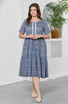 Сарафан из трикотажного полотна «кулирка» в сочетании двух видов в единой цветовой гамме: с мелкоузорчатым набивным рисунком, имитирующим ткацкое переплетение «рогожка» и с рисунком в мелкую клетку, отрезной по линии талии, с V-образной горловиной, центральной бортовой застежкой на обметанные петли и пуговицы и вышивкой на левой полочке лифа. Горловина спинки и проймы окантованы основным материалом. Юбка присборена по шву соединения с лифом. Съемный завязывающийся пояс фиксируется двумя шлевками из окантовки, вставленными в боковые швы на уровне талии.