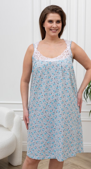 Сорочка женская из трикотажного полотна «кулирка» слегка расширенная книзу, без рукавов. Кружевные детали кокетки на полочке образуют V-ный вырез горловины. На нижней части полочки по шву притачивания кружевной кокетки заложены симметричные складки, проймы окантованы основным материалом.
